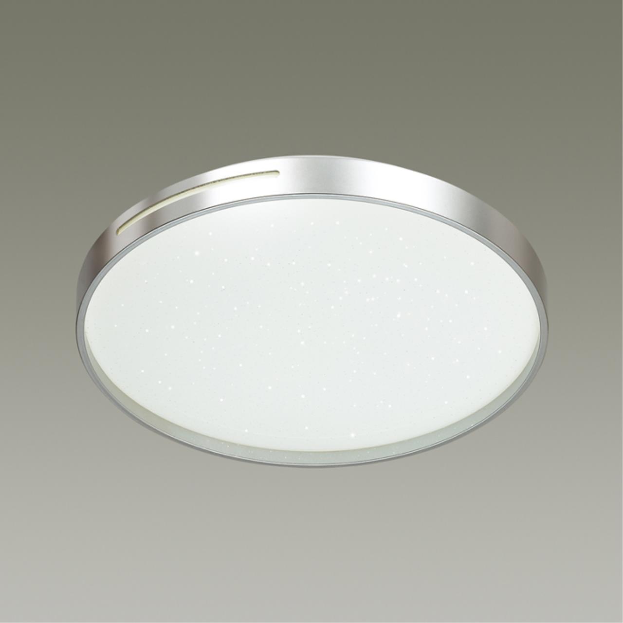 Светильник 2076/DL линии GETA SILVER состоит из металлического основания (базы) и пластикового рассеивателя. Материал рассеивателя - высококачественный акрил белого цвета с глянцевой поверхностью, обеспечивающий светильнику равномерное рассеивание и хорошее светопропускание. Форма плафона: круглая, декорирована ободом из пластика серебристого цвета и рисунком в виде прозрачных точек, которые придают включенному светильнику красивый эффект "звездного мерцания" и переливания. Степень защиты IP43 позволяет использовать светильник в определенных зонах влажных помещений. В комплект входит заменяемый LED модуль с линзами, мощностью 48Вт, которая соответствует лампе накаливания 430Вт. А также пульт ДУ, с помощью которого осуществляется плавное изменение цветовой температуры 3000-6300К, изменение яркости, переход в режим переключения теплого/белого/холодного/ночного света. Светильник имеет функцию "память".