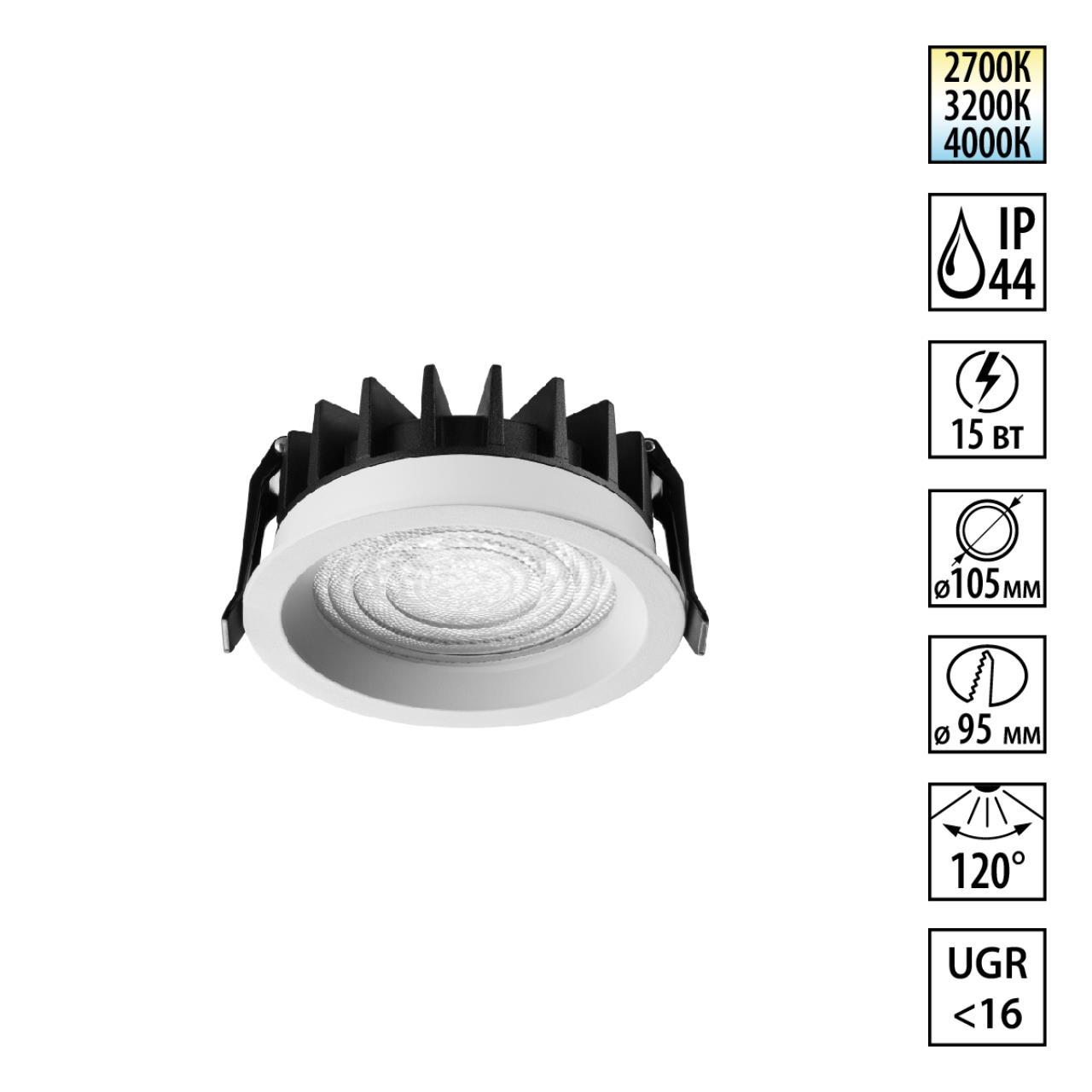 359844 WIR NT25 504 белый Светильник встраиваемый с переключателем цв. температуры IP44 LED 15W 220-240V 2700К\3200К\4000К FLUO
