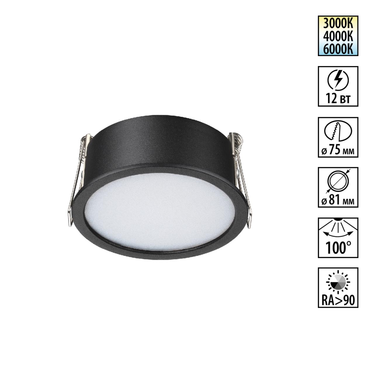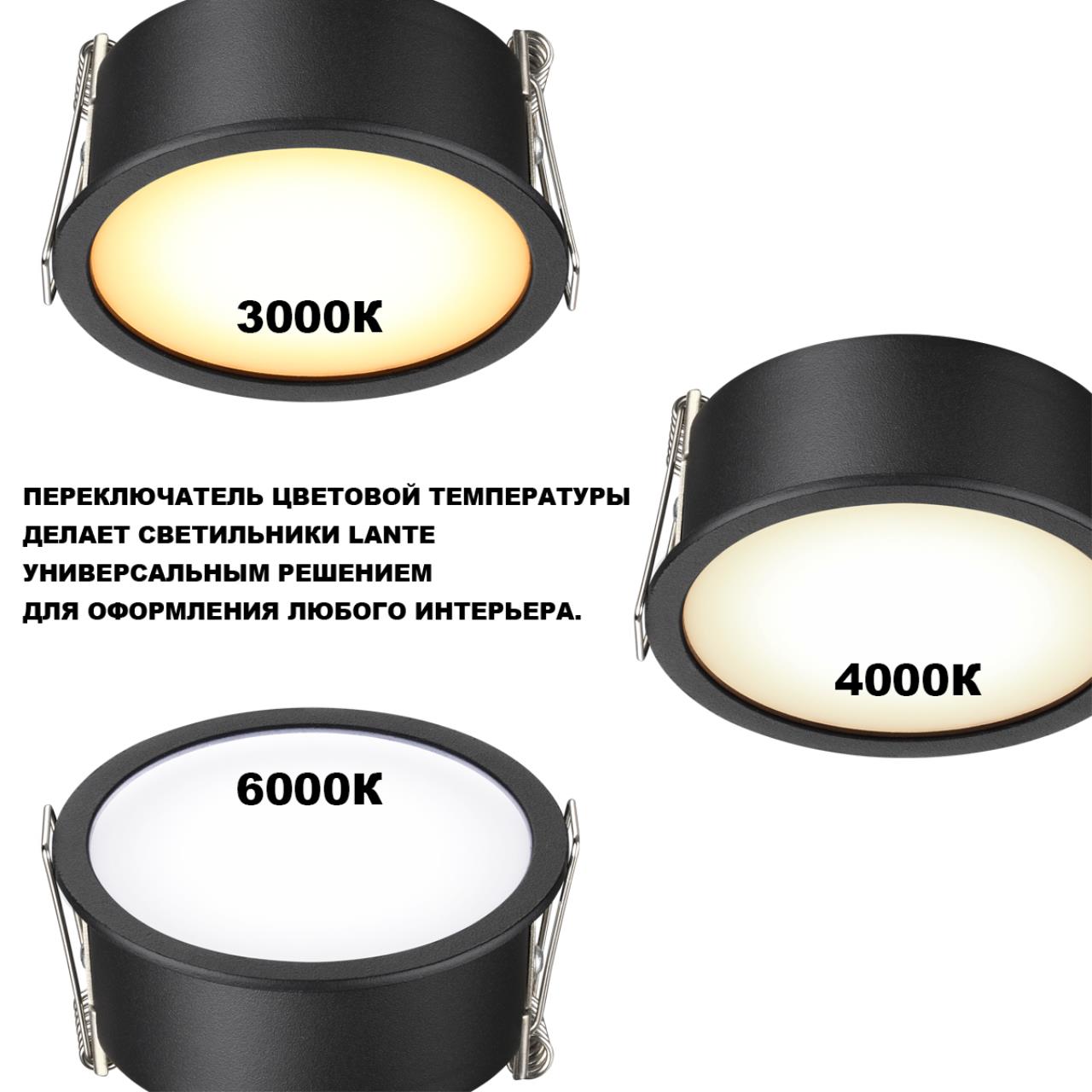 359878 WIR NT26 000 черный Светильник встраиваемый с переключателем цв. температуры IP20 LED 12W 100-265V 3000К/4000К/6000К LANTE