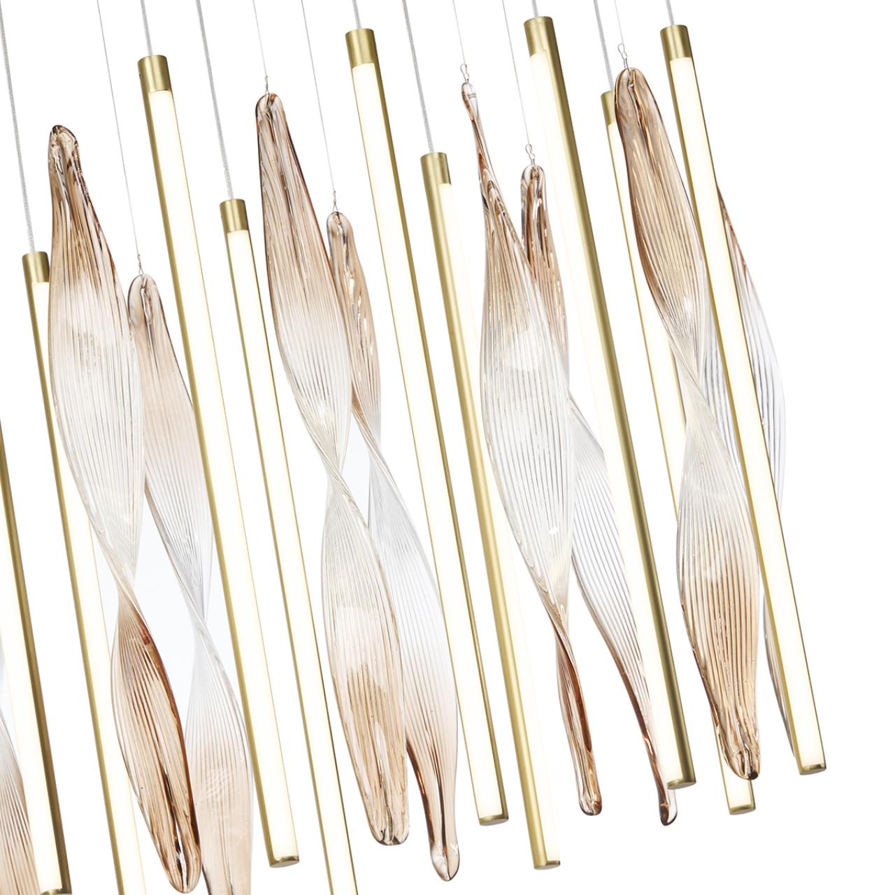 Линия Spira воплощает утонченную эстетику: стеклянные спирали с рифленой поверхностью переливаются гранями, оттененные коричневым градиентом на концах. Ниспадающие стеклянные подвески дополнены тонкими металлическими трубками с встроенным LED-источниками с цветовой температурой 3500 K, которые создают особый архитектурный ритм композиции. Возможность регулировать высоту подвесок дает свободу в создании индивидуальной световой композиции — легкой и воздушной.