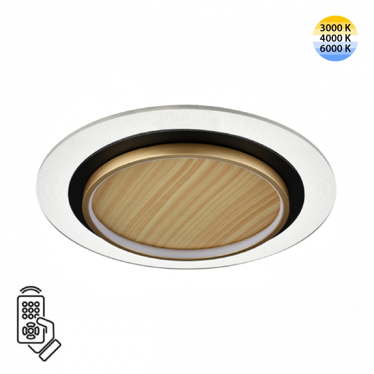 Центральная часть светильника выполнена из металла и реалистично выкрашена в цвет светлого дерева. Светодиодный модуль располагается по внутренней части корпуса светильника, а также по его контуру. Благодаря акриловому ободу светильник имеет красивый "ореол" по окружности и дополнительный источник освещения. Светильник оснащен пультом ДУ.