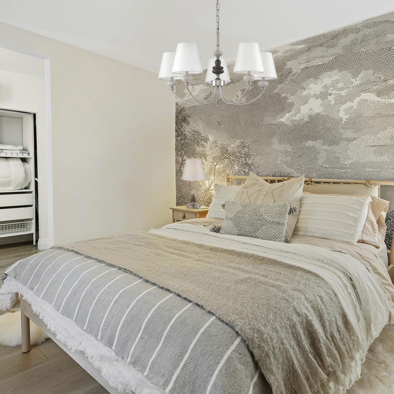 Тонкая изящная арматура в цвете никель украшена керамическим элементом необчной формы в коричнево-белом цвете. Классический белый плафон вечает всю композицию стильной линии KENTUKI. Благодаря полной коллекции линия позволит полностью укомплектовать гостинную, спальню или номер премиальной гостиницы.