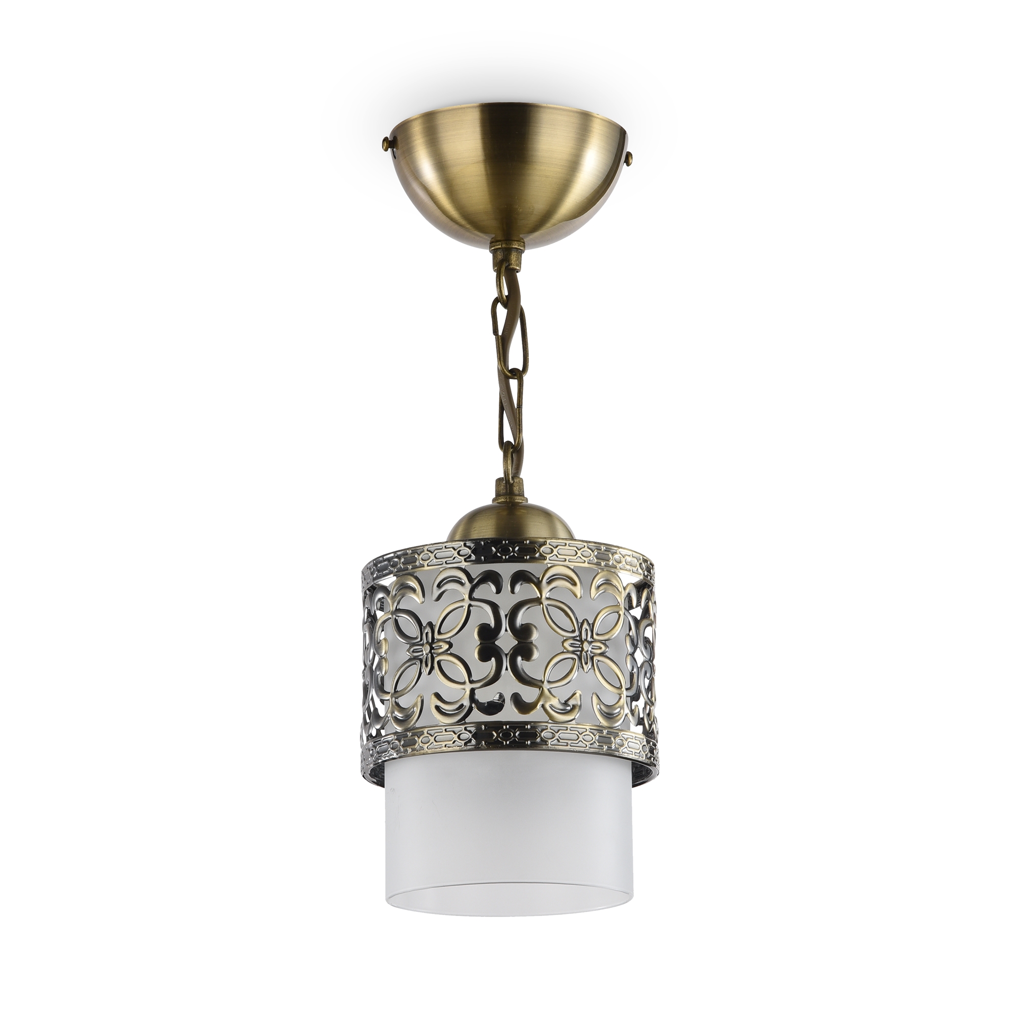 Подвес имеет два плафона: плафон из матового стекла и декоративный металлический плафон с ажурным узором и фигурной чеканкой на ободке. Цвета арматуры и металлического декоративного плафона - французское золото, античная бронза и белый с золотистым патинированием.