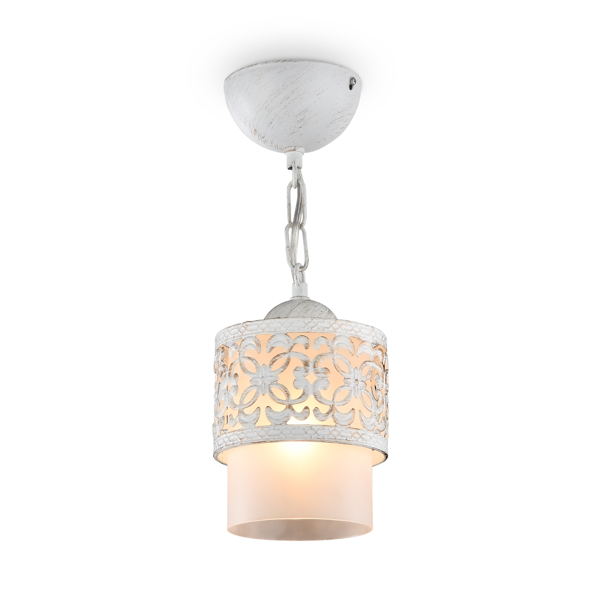 Подвес имеет два плафона: плафон из матового стекла и декоративный металлический плафон с ажурным узором и фигурной чеканкой на ободке. Цвета арматуры и металлического декоративного плафона - французское золото, античная бронза и белый с золотистым патинированием.