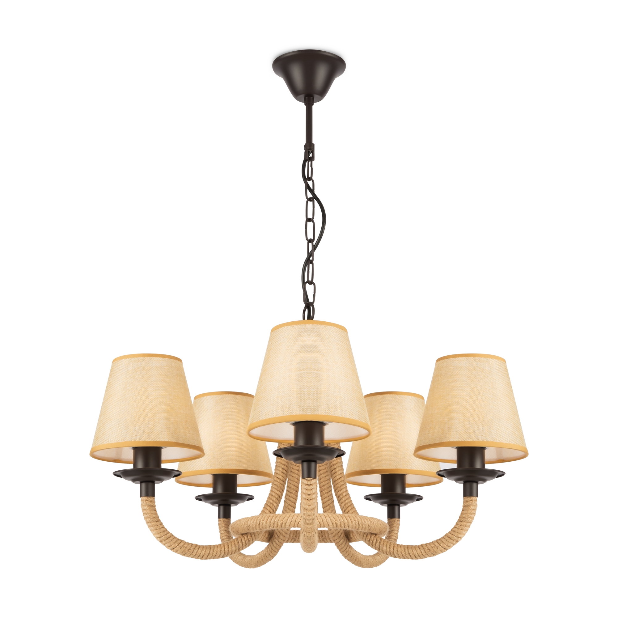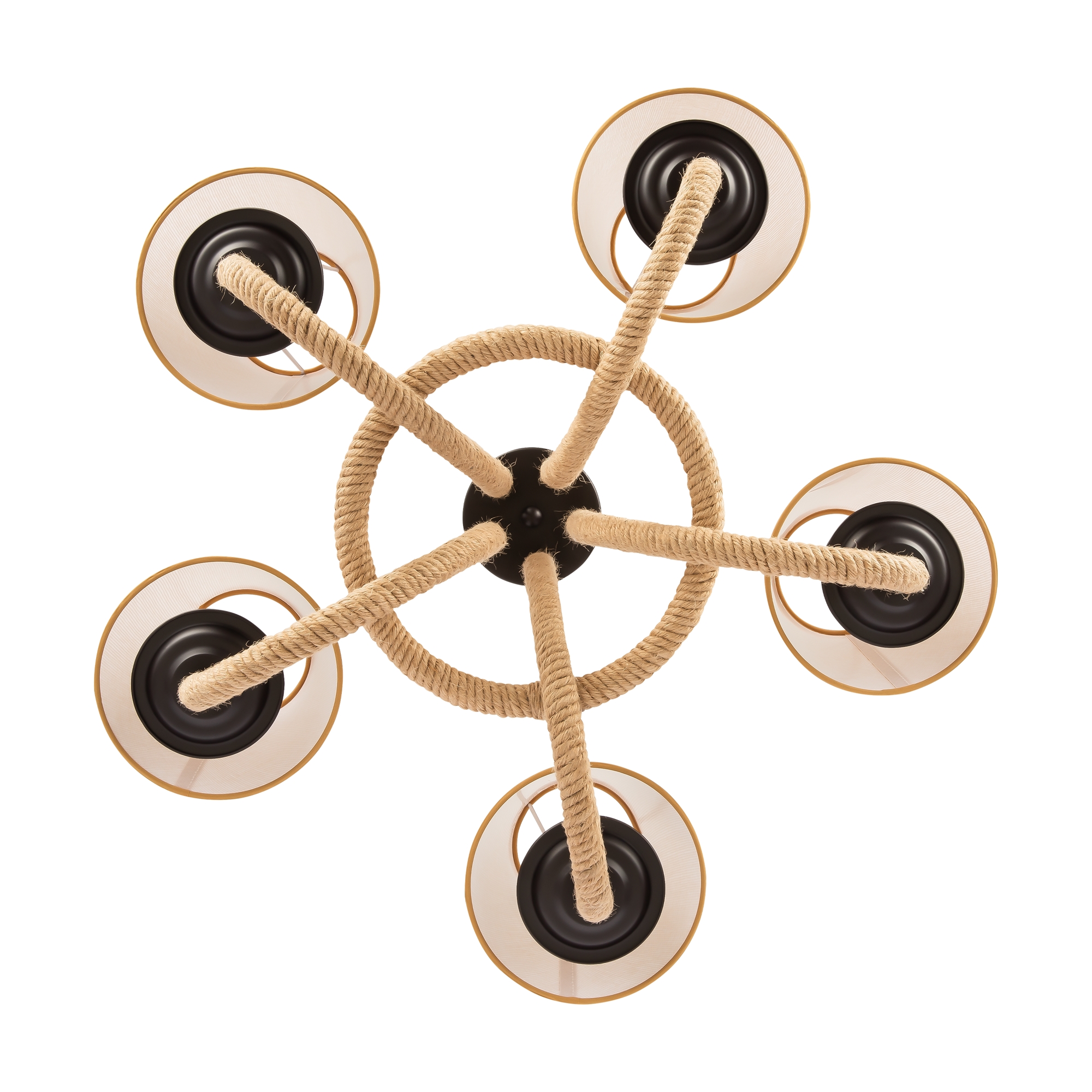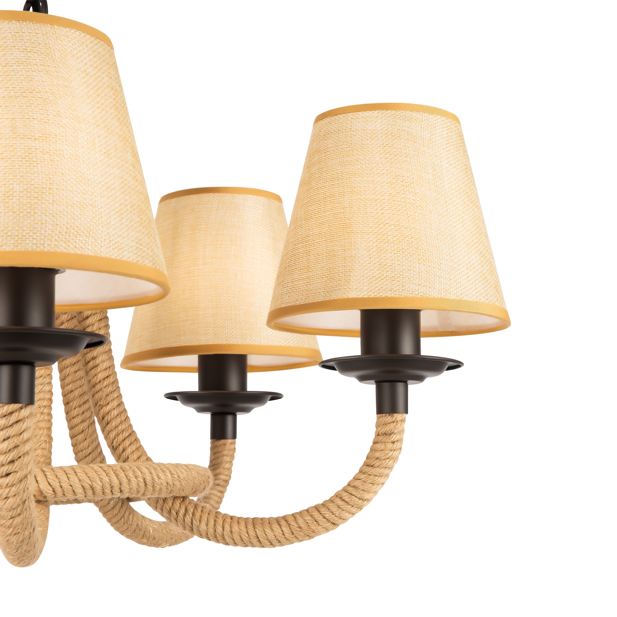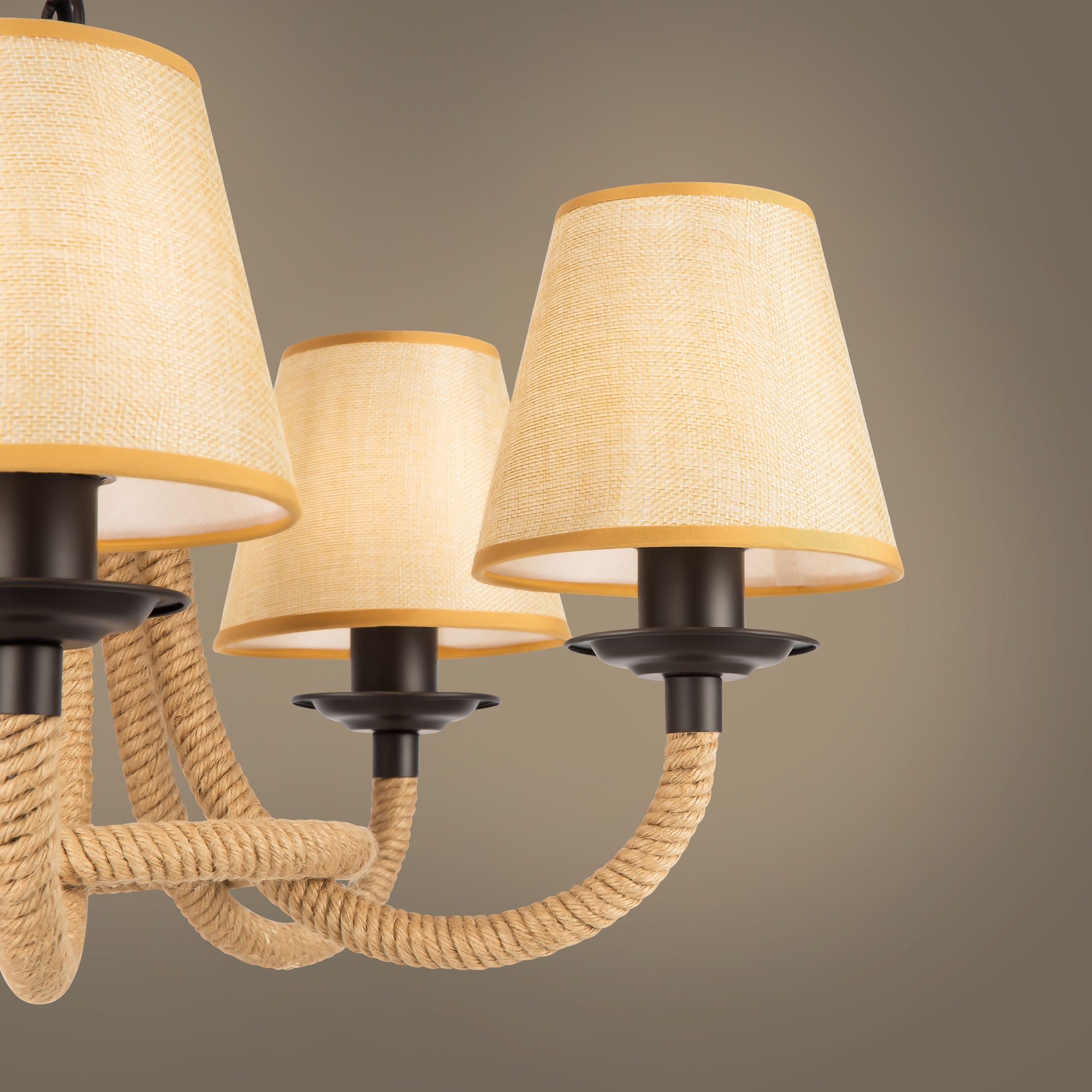 Серия светильников создана под влиянием основных принципов эко-дизайна, с использованием натуральных материалов для предметов интерьера. Арматура люстры из матового черного металла с легким золотым патинированием гармонично сочетается с абажурами из холщовой натуральной ткани. Рожки и центральная часть люстры плотно обвиты холщовой веревкой. Окантовка на верхней и нижней части абажура желто-песочного цвета.
