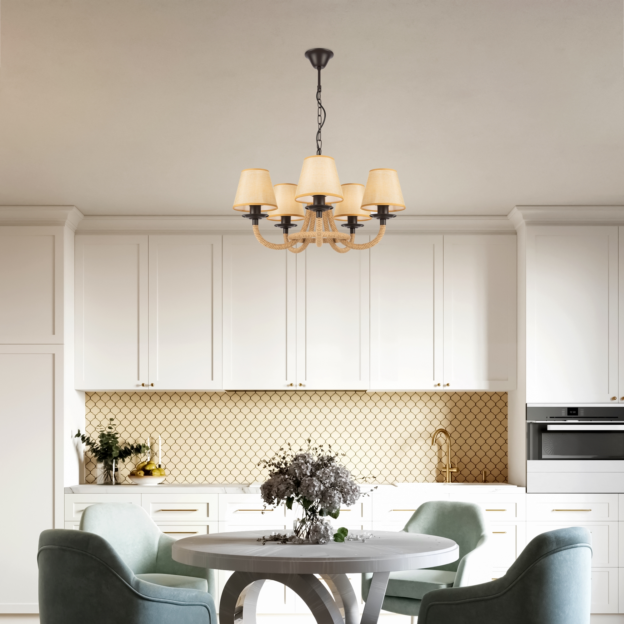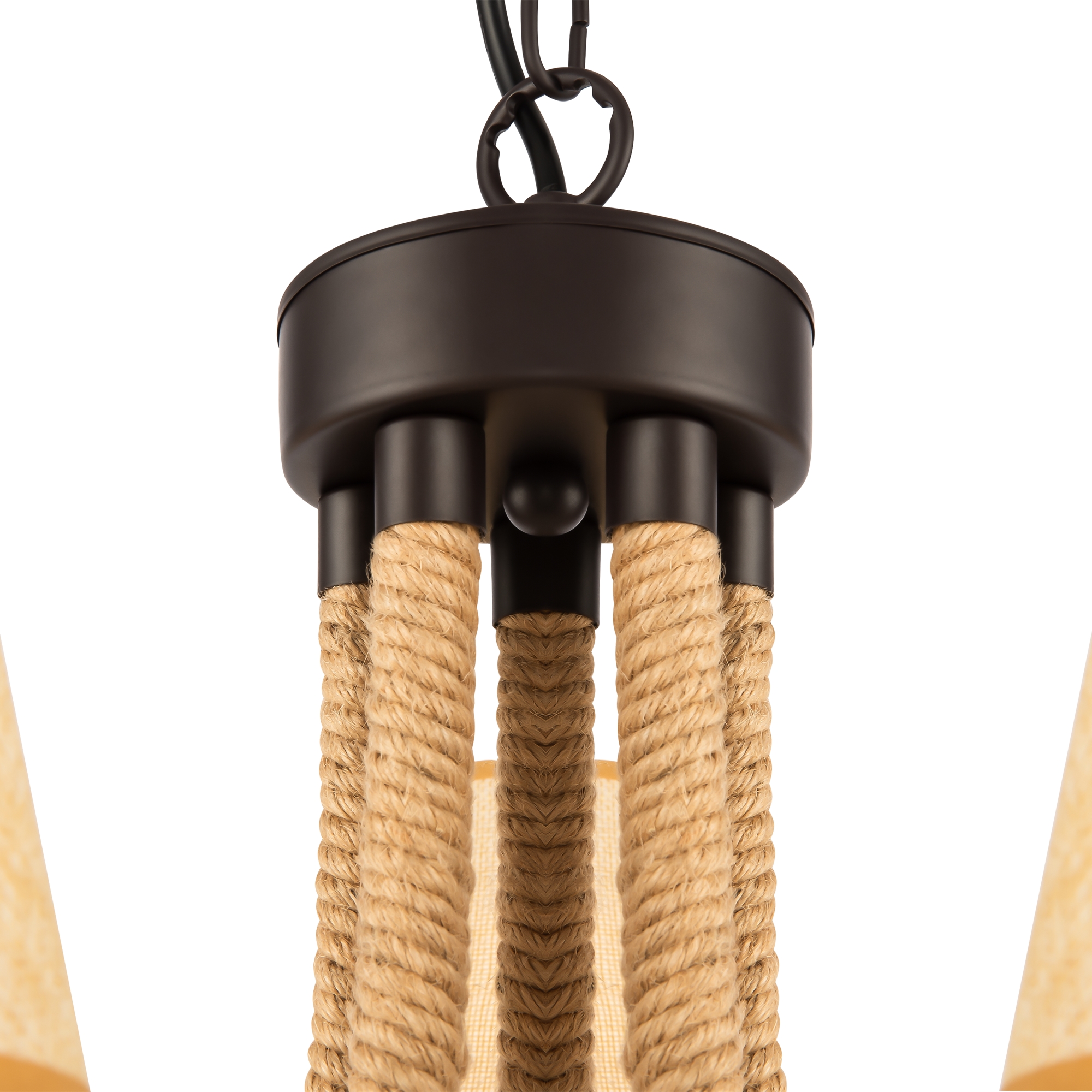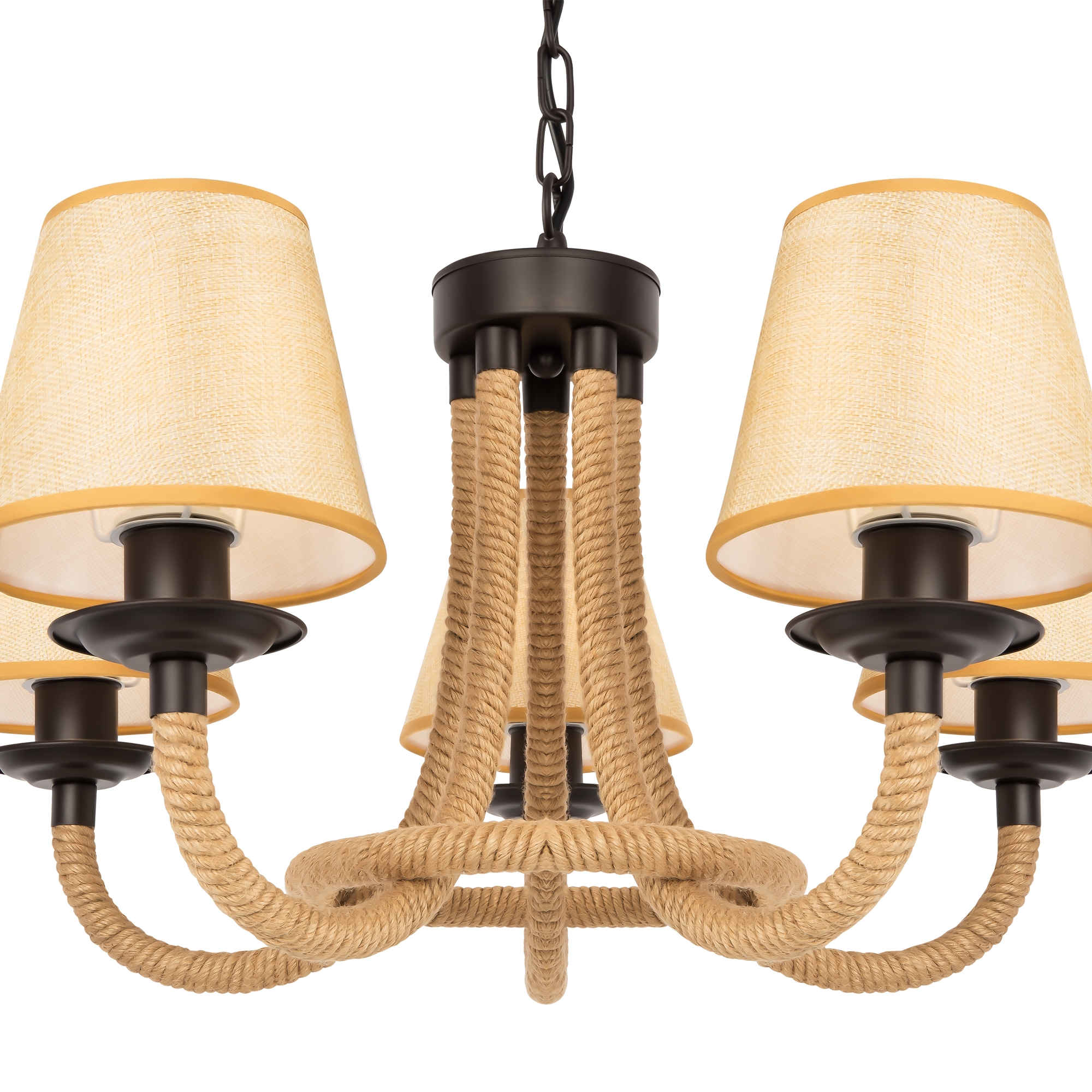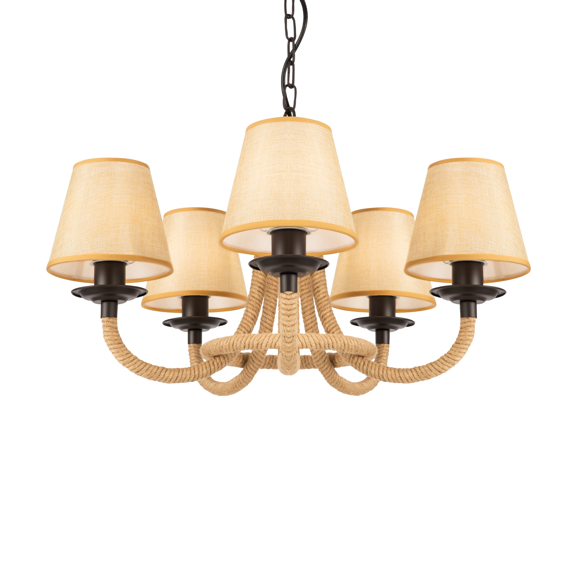 Серия светильников создана под влиянием основных принципов эко-дизайна, с использованием натуральных материалов для предметов интерьера. Арматура люстры из матового черного металла с легким золотым патинированием гармонично сочетается с абажурами из холщовой натуральной ткани. Рожки и центральная часть люстры плотно обвиты холщовой веревкой. Окантовка на верхней и нижней части абажура желто-песочного цвета.