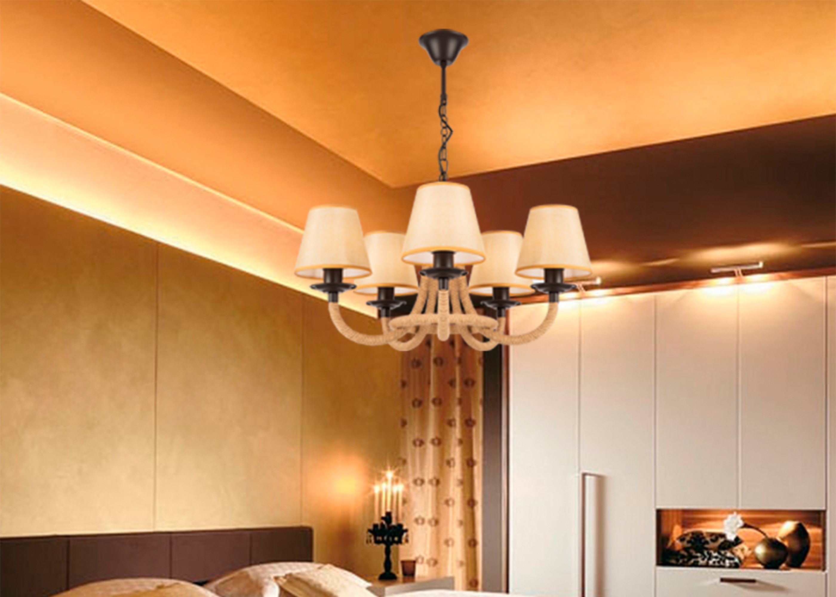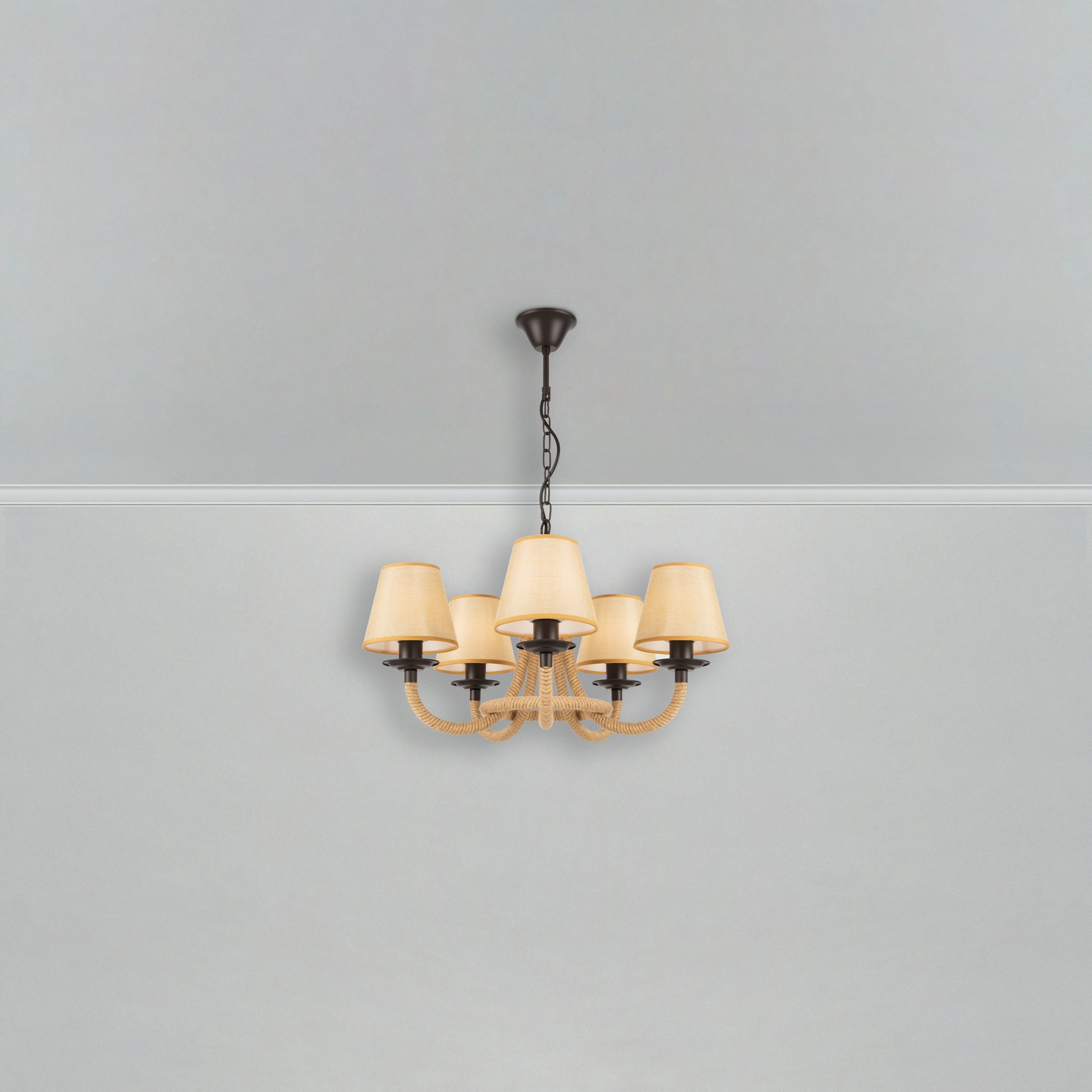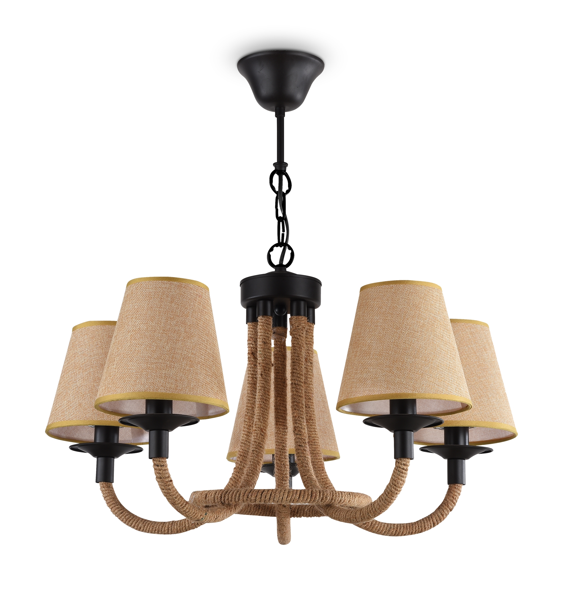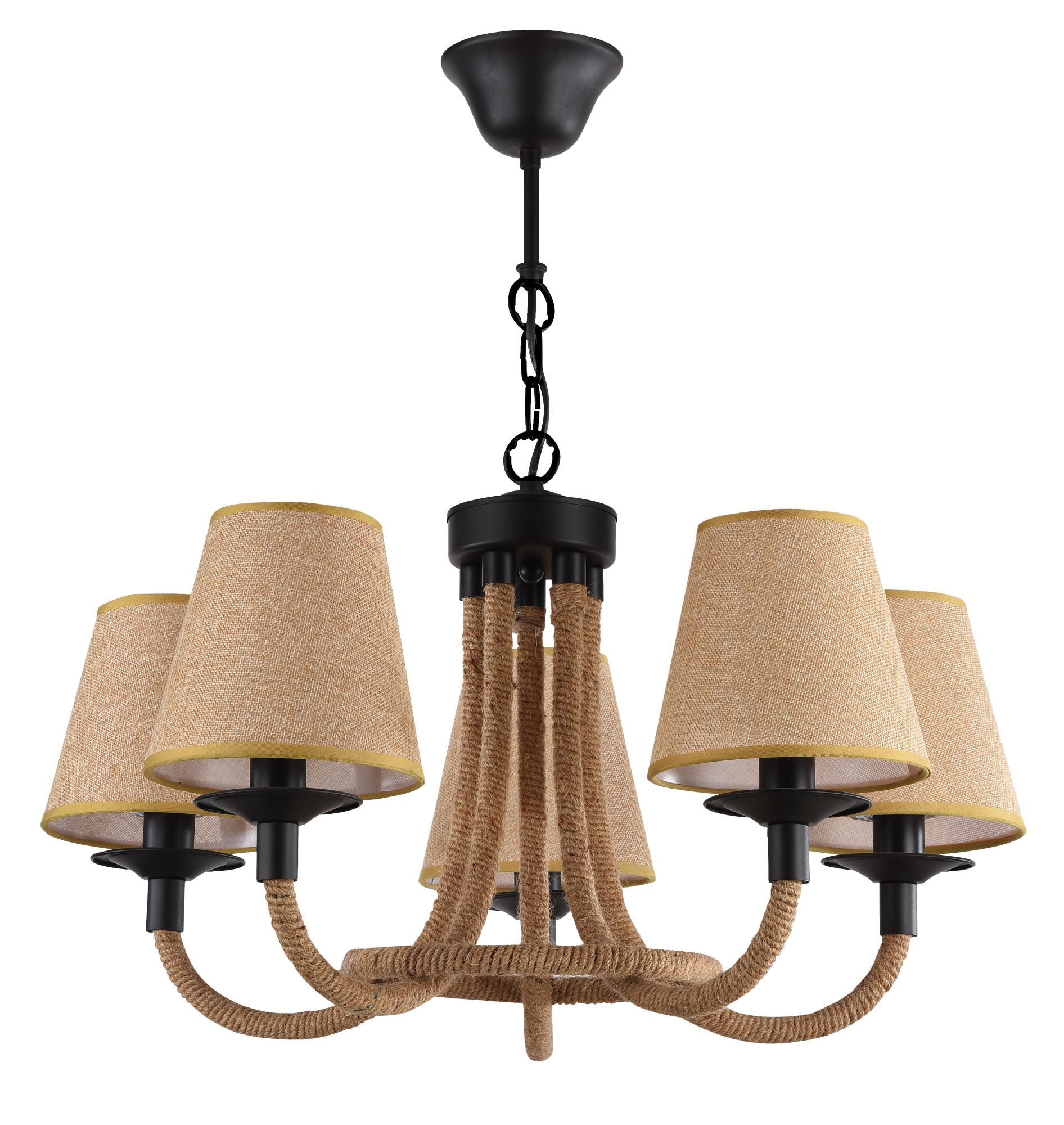 Серия светильников создана под влиянием основных принципов эко-дизайна, с использованием натуральных материалов для предметов интерьера. Арматура люстры из матового черного металла гармонично сочетается с абажурами из холщовой натуральной ткани. Рожки и центральная часть люстры плотно обвиты холщовой веревкой. Окантовка на верхней и нижней части абажура желто-песочного цвета.