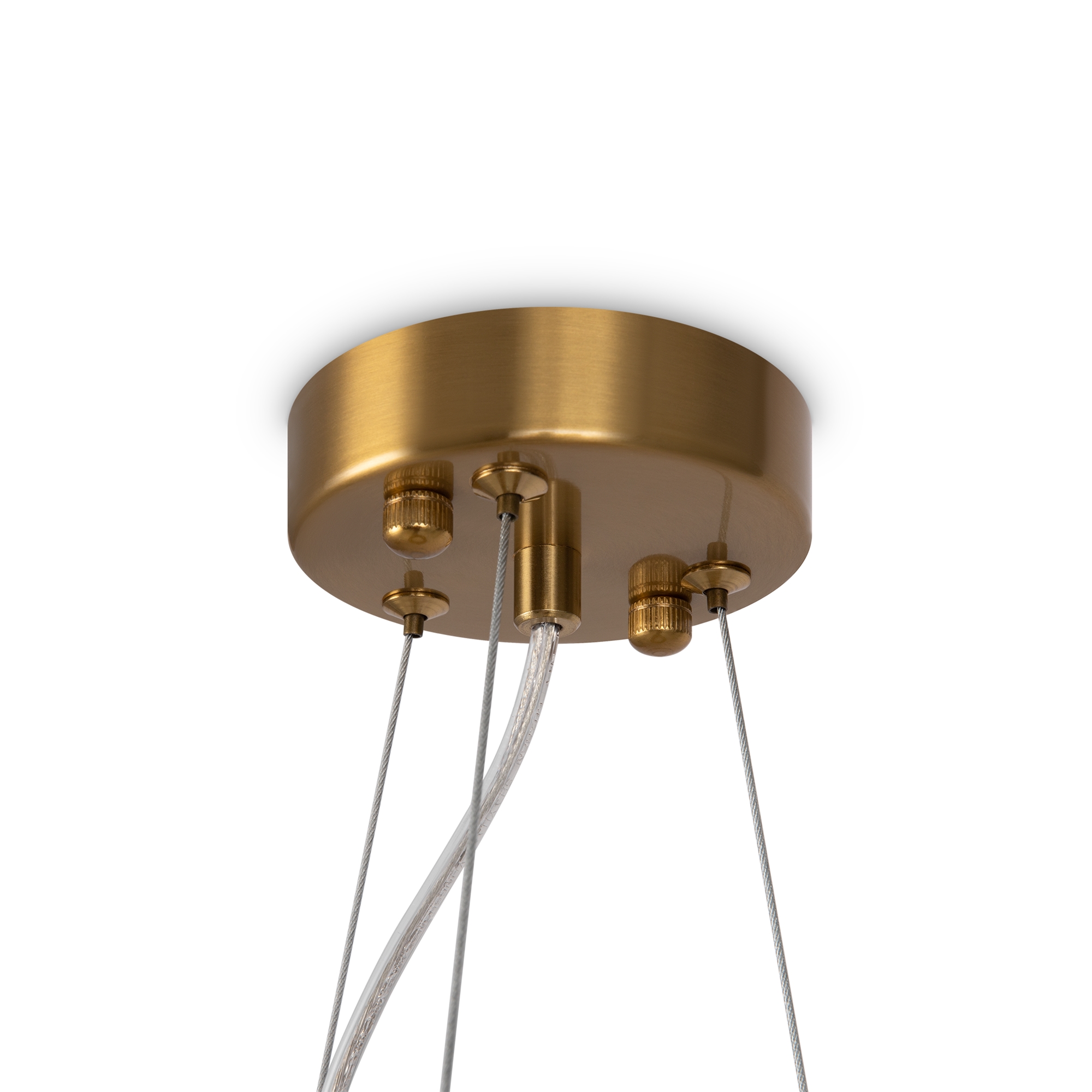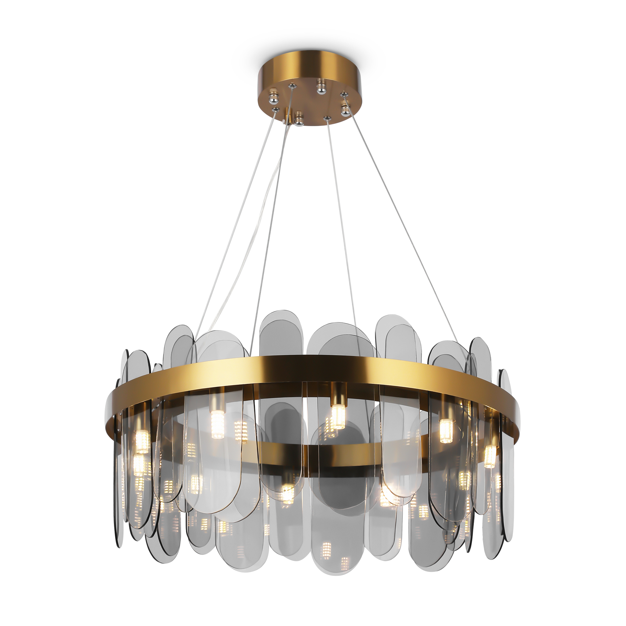 Арматура из металла. Цвет – латунь и никель. Стеклянный декор в двух вариантах: фактурный с эффектом «замороженного стекла» и глянцевый дымчатого оттенка. Источник света – лампа G9.