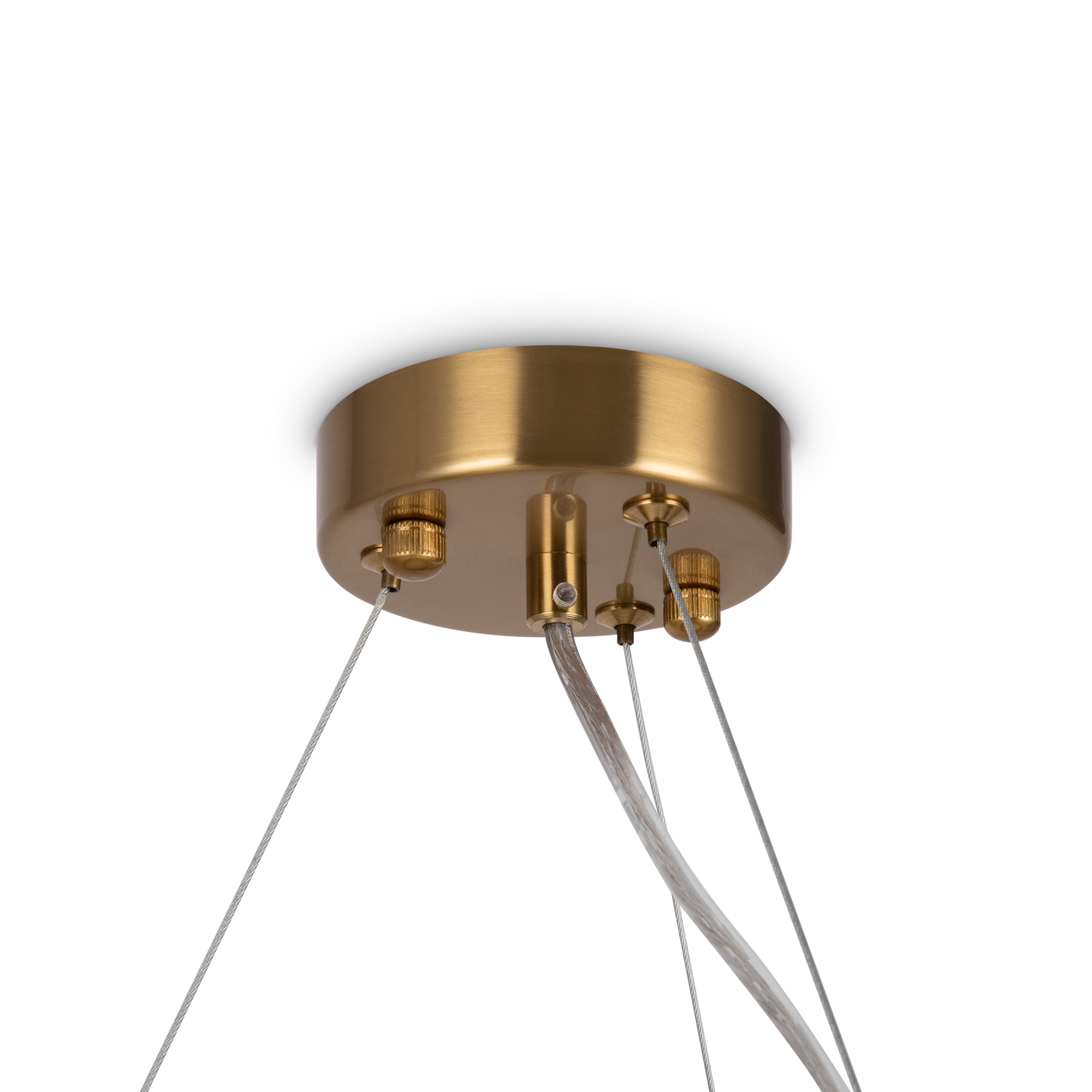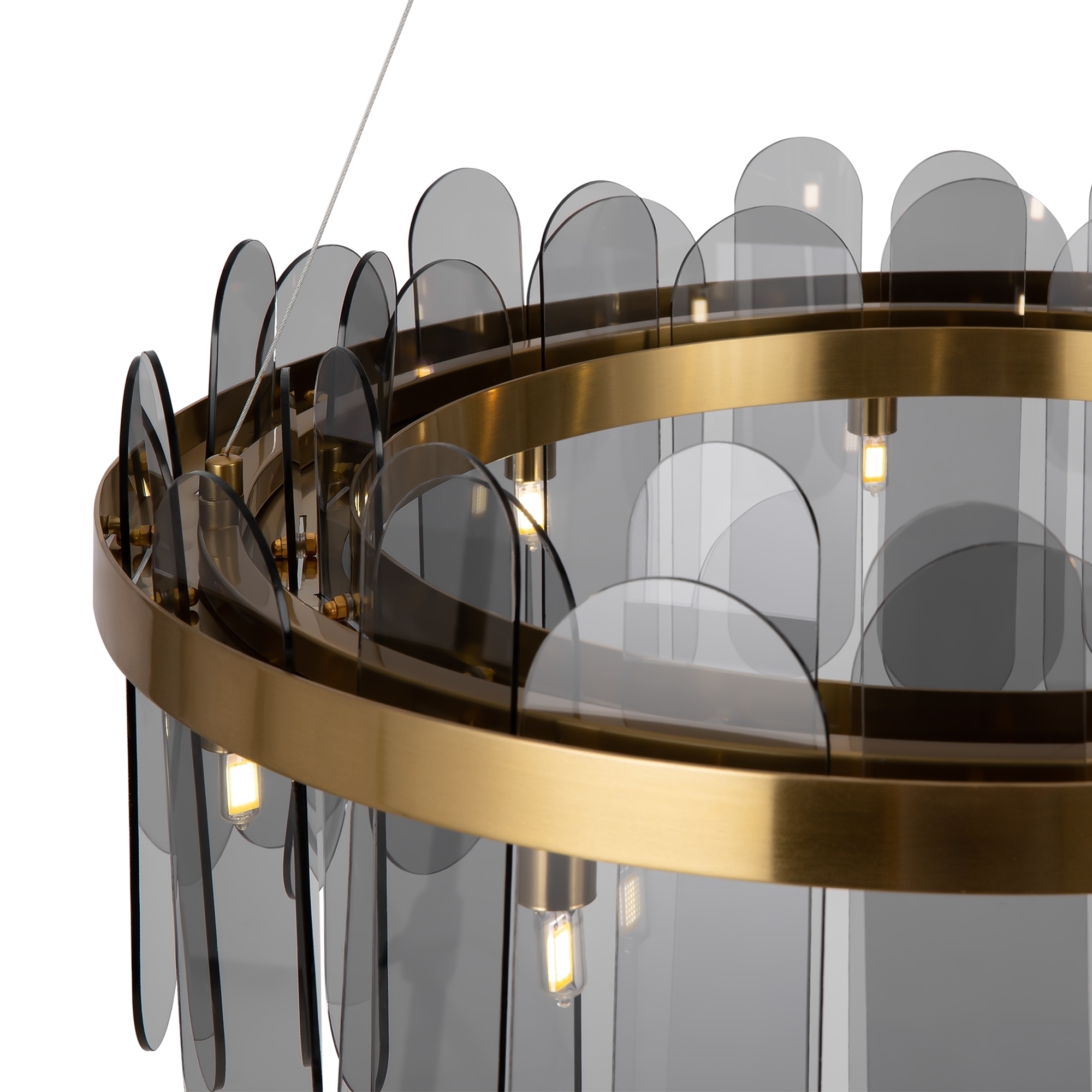 Арматура из металла. Цвет – латунь и никель. Стеклянный декор в двух вариантах: фактурный с эффектом «замороженного стекла» и глянцевый дымчатого оттенка. Источник света – лампа G9.