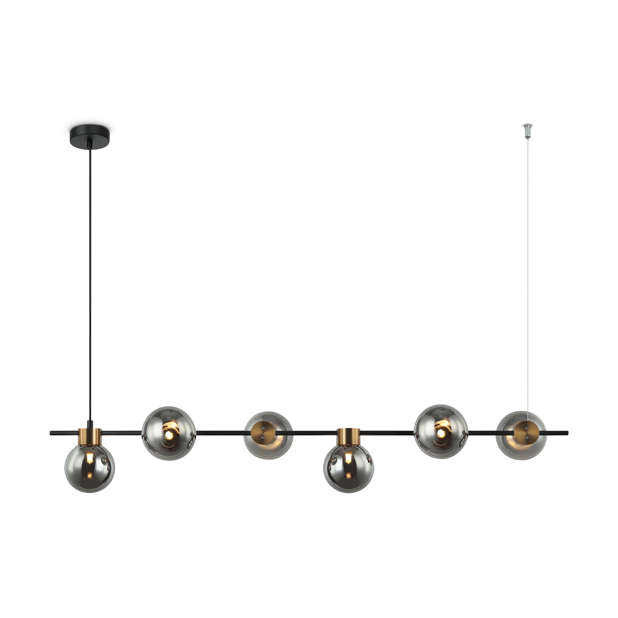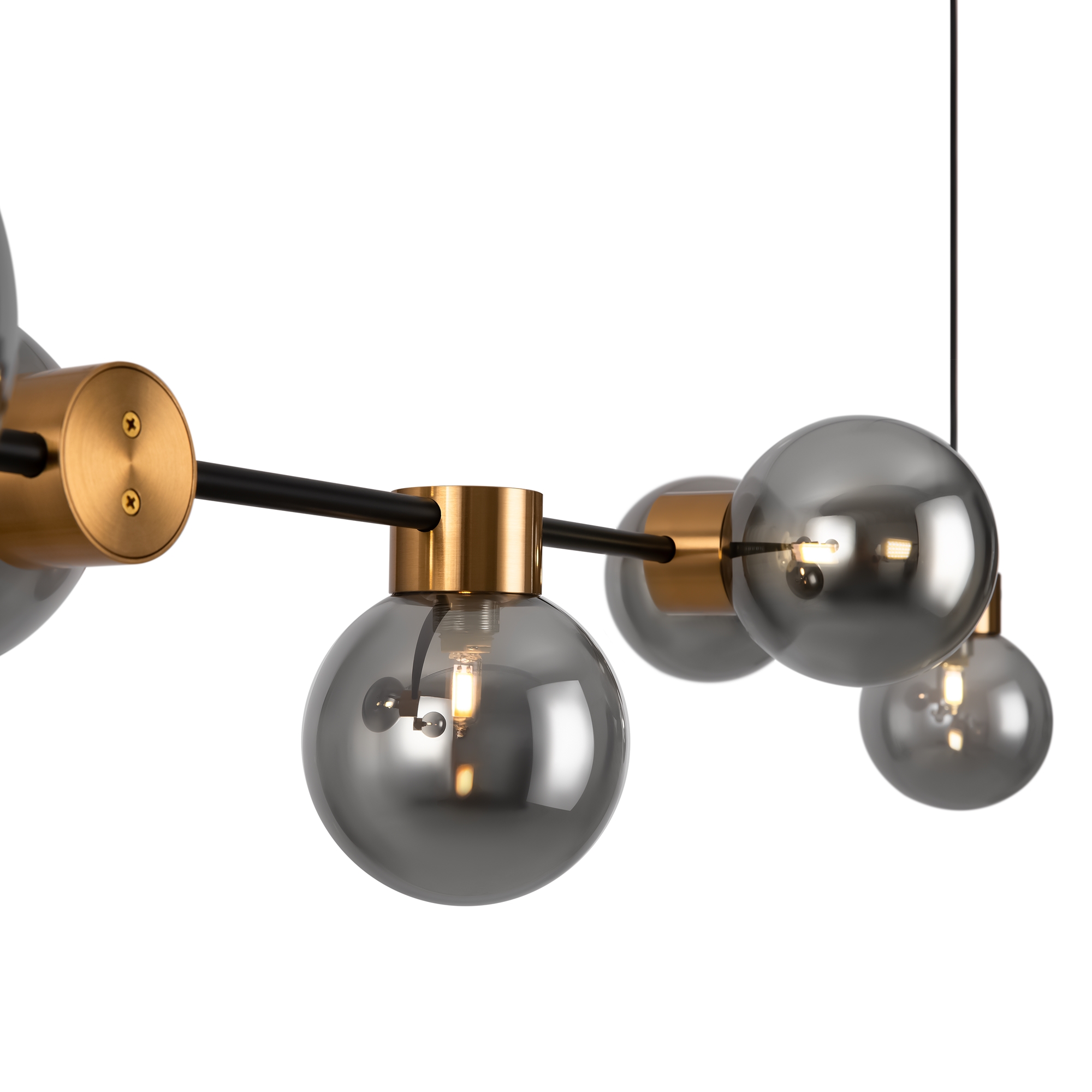 Металлическая арматура, цвет - черный + латунь. Стеклянные плафоны в двух оттенках - матовый белый или дымчатый. Направление плафонов в разные стороны позволяет распределить свет максимально равномерно. Источник светал - лампы с цоколем G9.