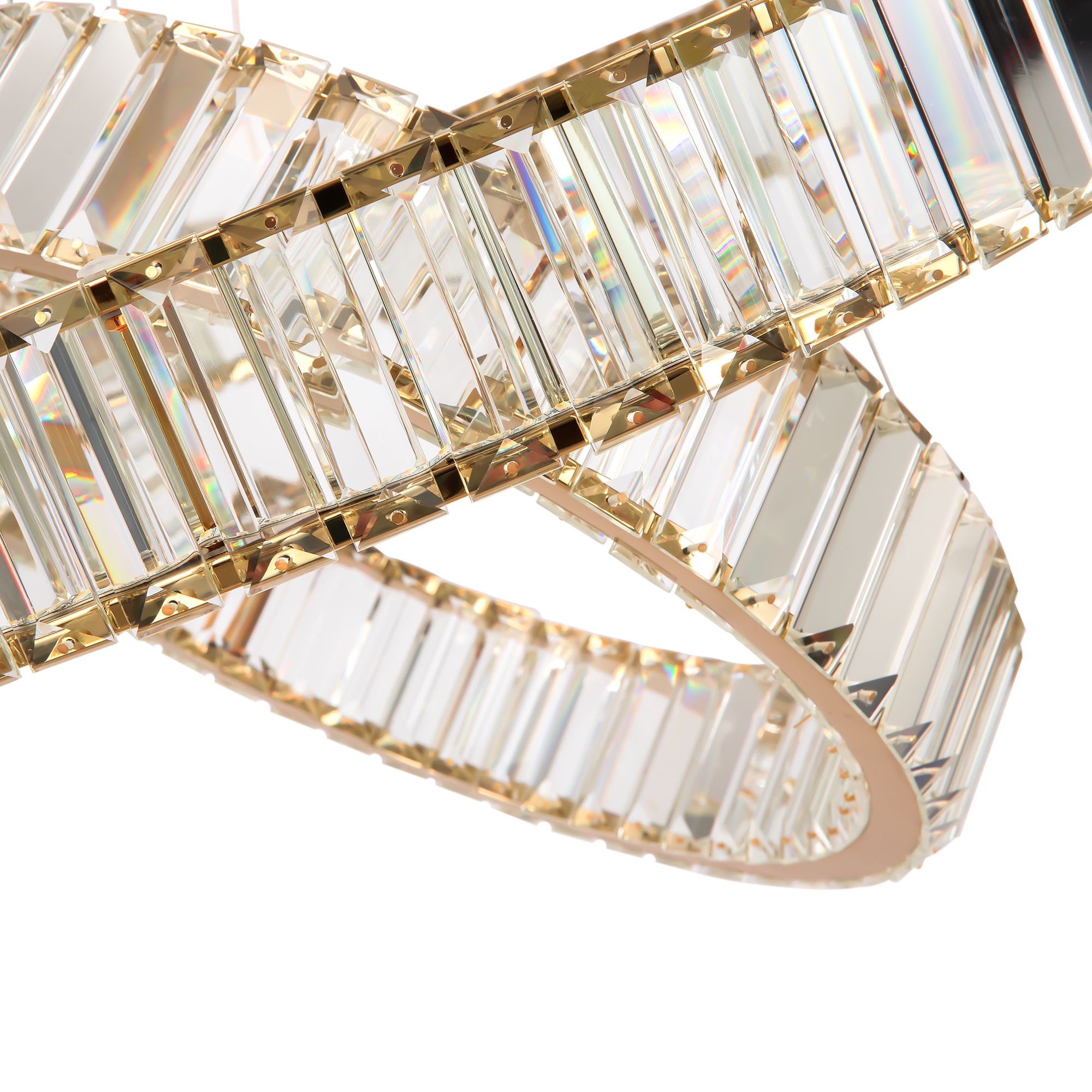 Металлическая арматура в цвете латунь и хром. Хрустальные декоративные кольца с геометричными гранями. LED-источник света. Регулировка цветовой температуры (3000-4000-5000K) и яркости 4G-dimming при помощи пульта (в комплекте).