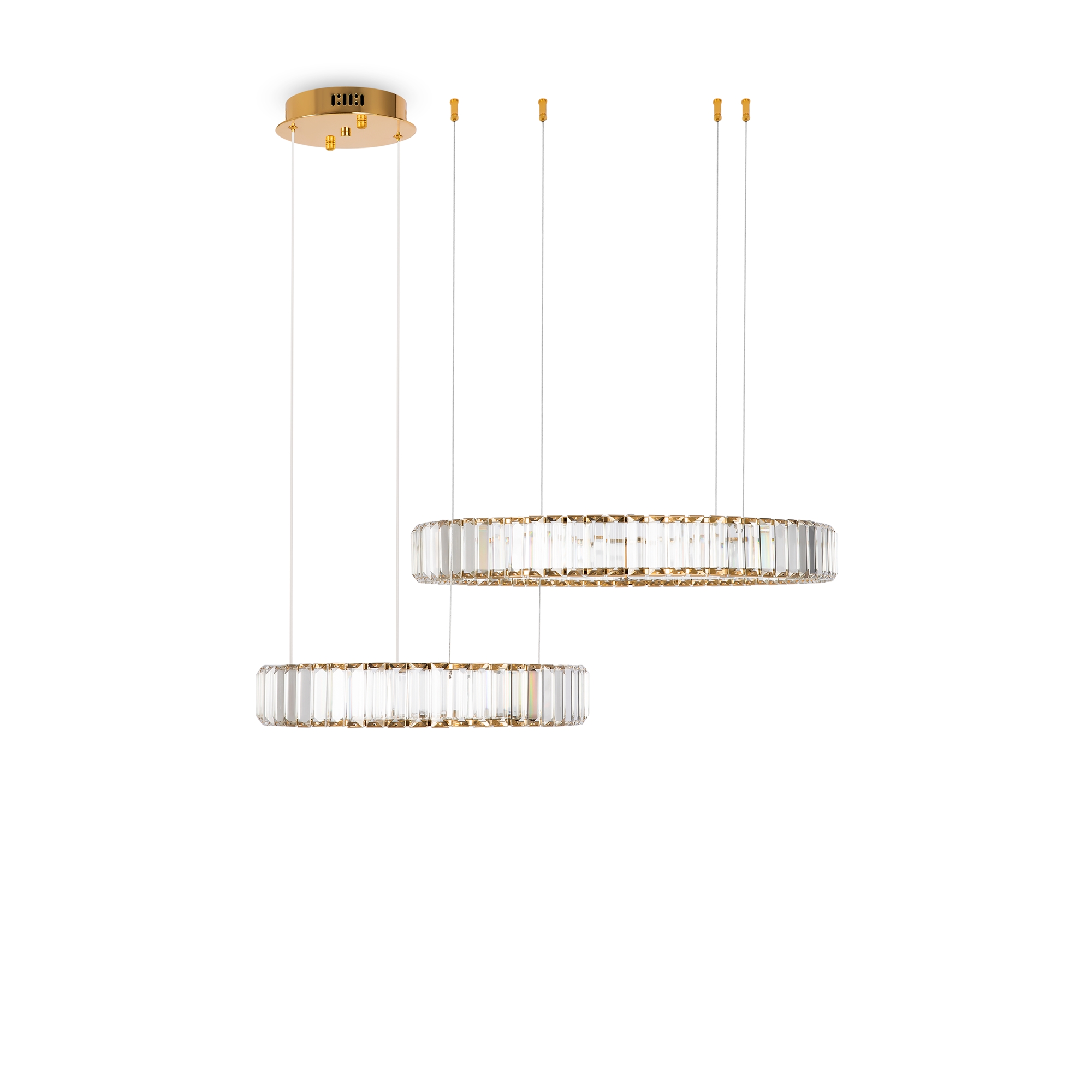 Металлическая арматура в цвете латунь и хром. Хрустальные декоративные кольца с геометричными гранями. LED-источник света. Регулировка цветовой температуры (3000-4000-5000K) и яркости 4G-dimming при помощи пульта (в комплекте).