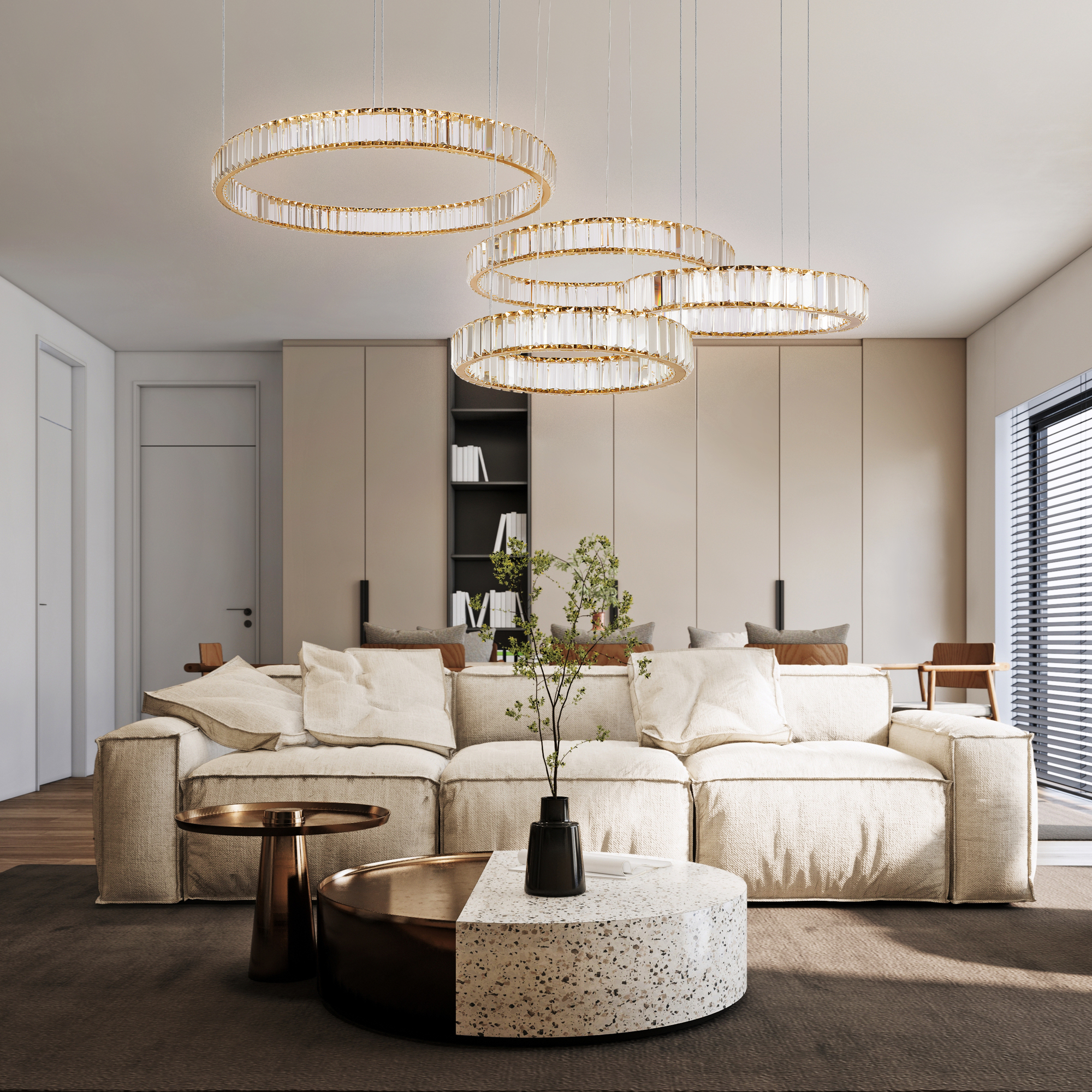 Металлическая арматура в цвете латунь и хром. Хрустальные декоративные кольца с геометричными гранями. LED-источник света. Регулировка цветовой температуры (3000-4000-5000K) и яркости 4G-dimming при помощи пульта (в комплекте).
