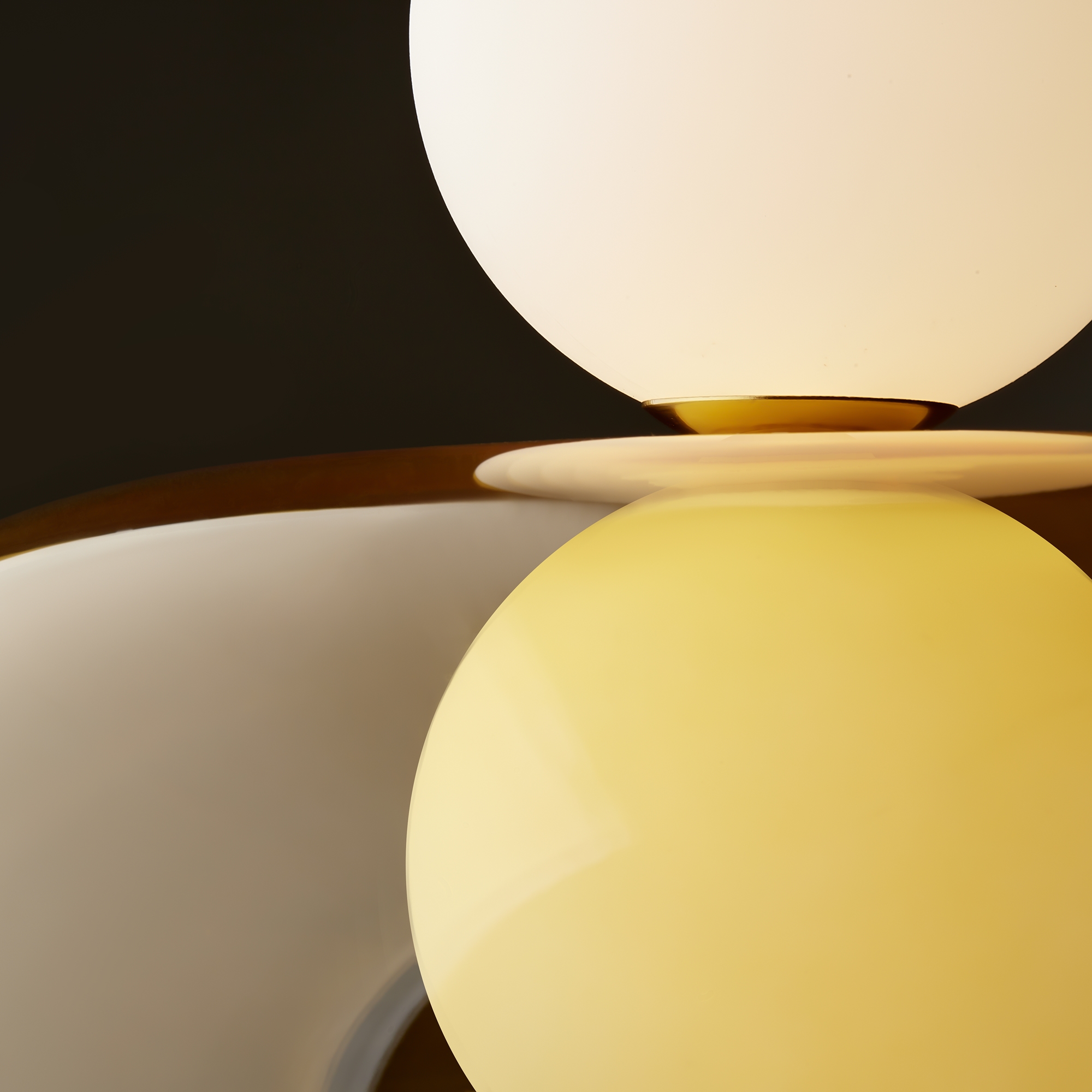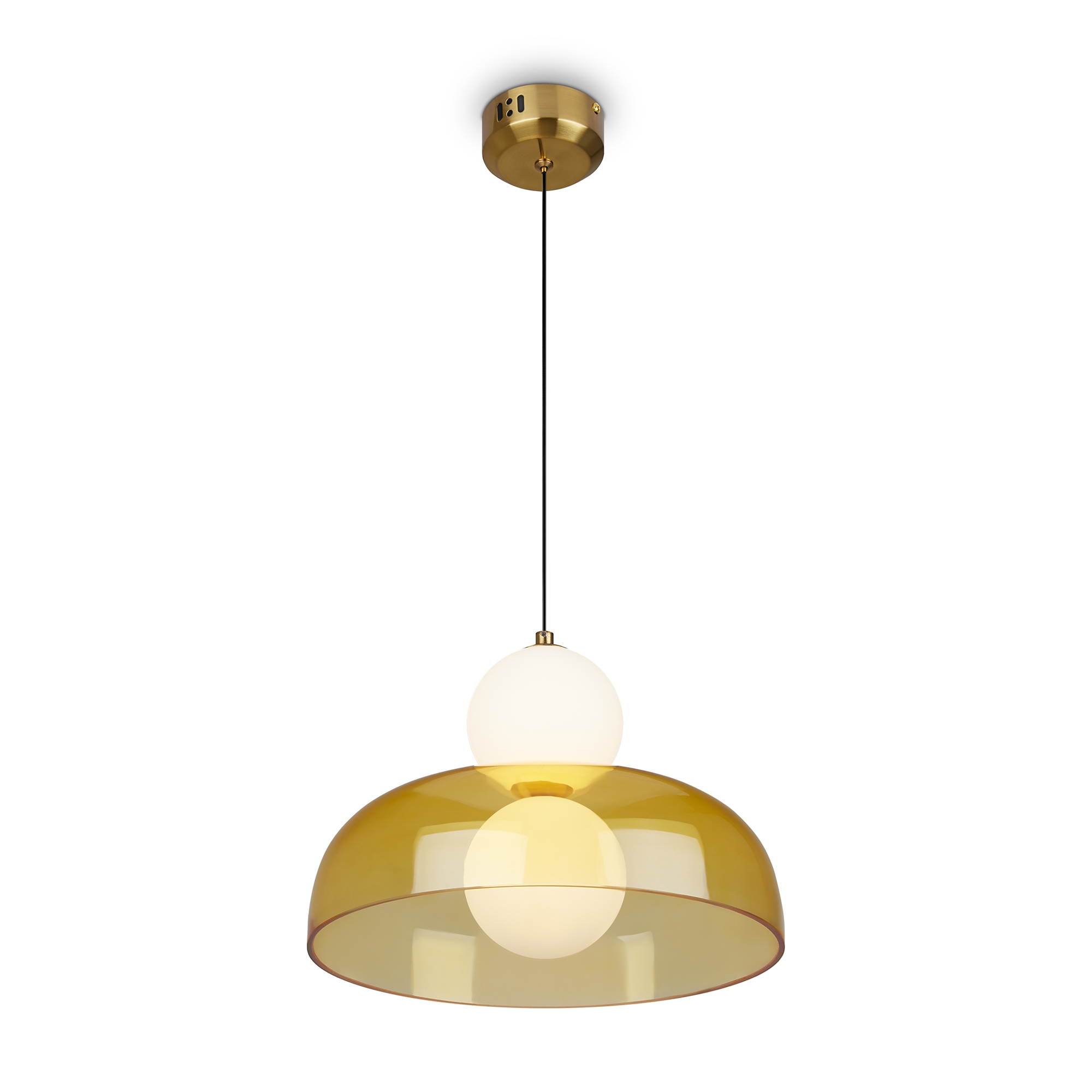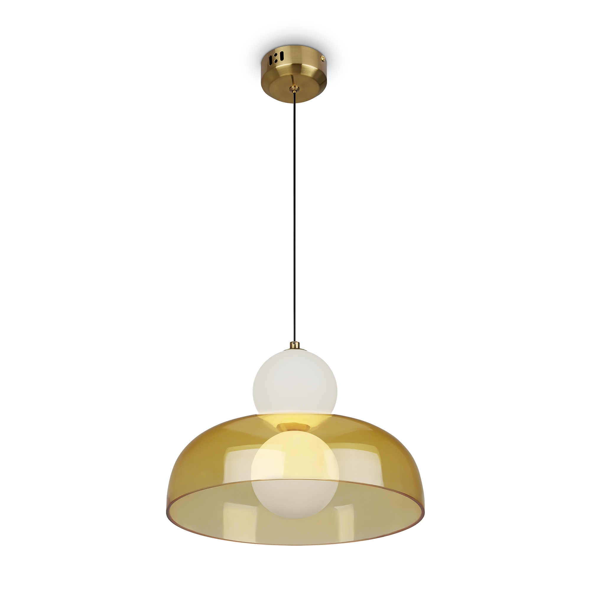 Арматура - металл, цвет - латунь. Стеклянные плафоны в виде сдвоенных матовых “шариков” дополнены широкими декоративными плафонами из стекла двух оттенков: дымчатый и янтарный. LED-источник света. Цветовая температура - 3000К. Светильники подойдут для светлых интерьеров и детских комнат.