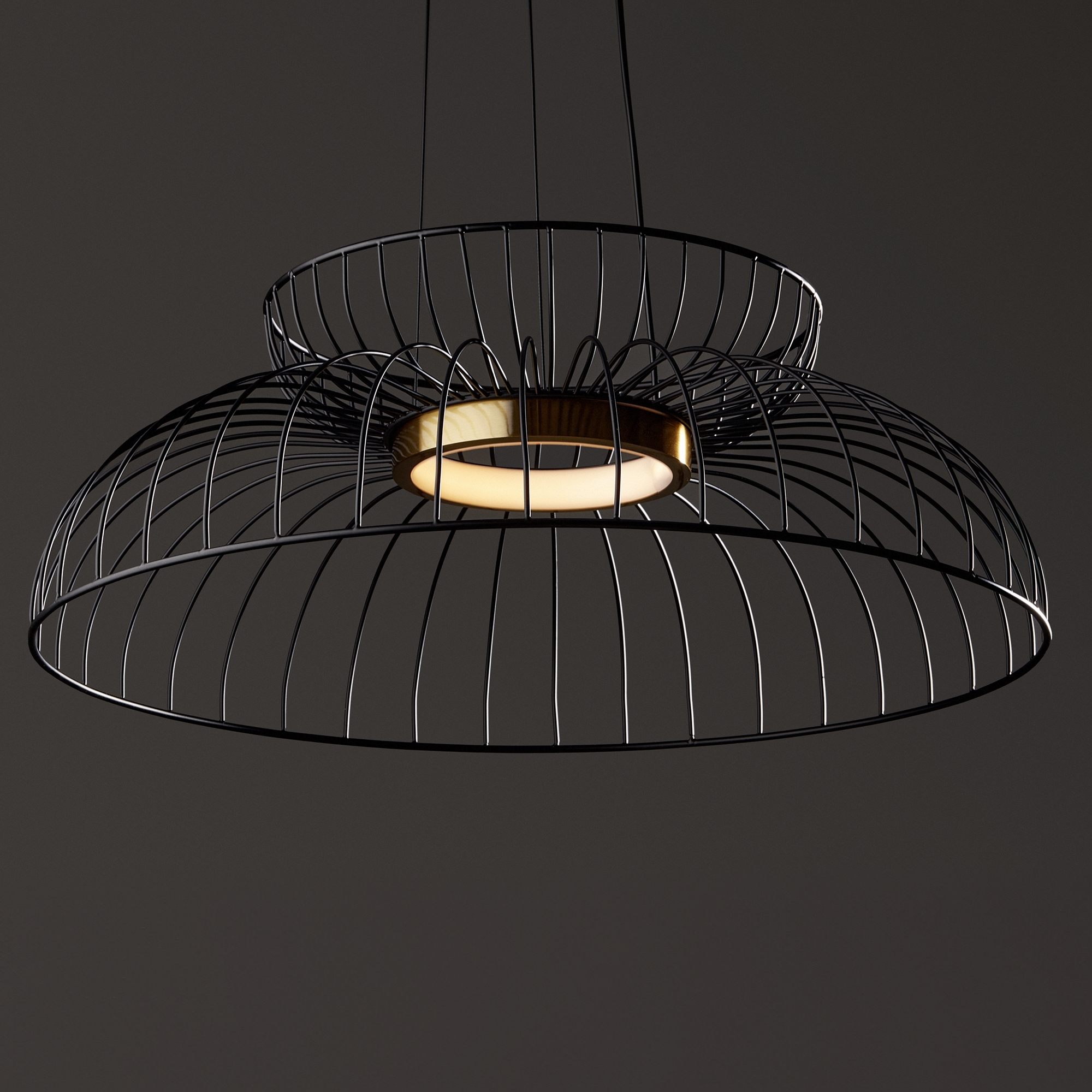 Металлическая арматура чёрного цвета. LED-источник света обрамлен декоративным металлическим кольцом цвета латунь. Минималистичный дизайн - хорошо сочетается с другими осветительными приборами. Высота подвеса регулируется. Цветовая температура - 3000К.