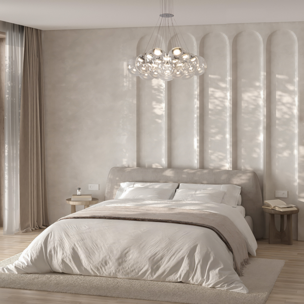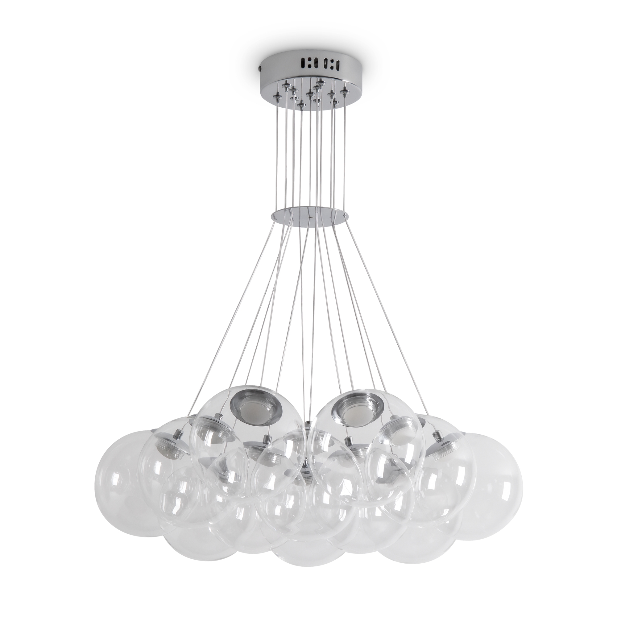 Арматура - металл (никель). Абажуры из дутого стекла с LED (2800K). Прозрачные плафоны подчеркивают современный дизайн. Высота 500-2500 мм. Серия станет ярким акцентом в вашем интерьере.
