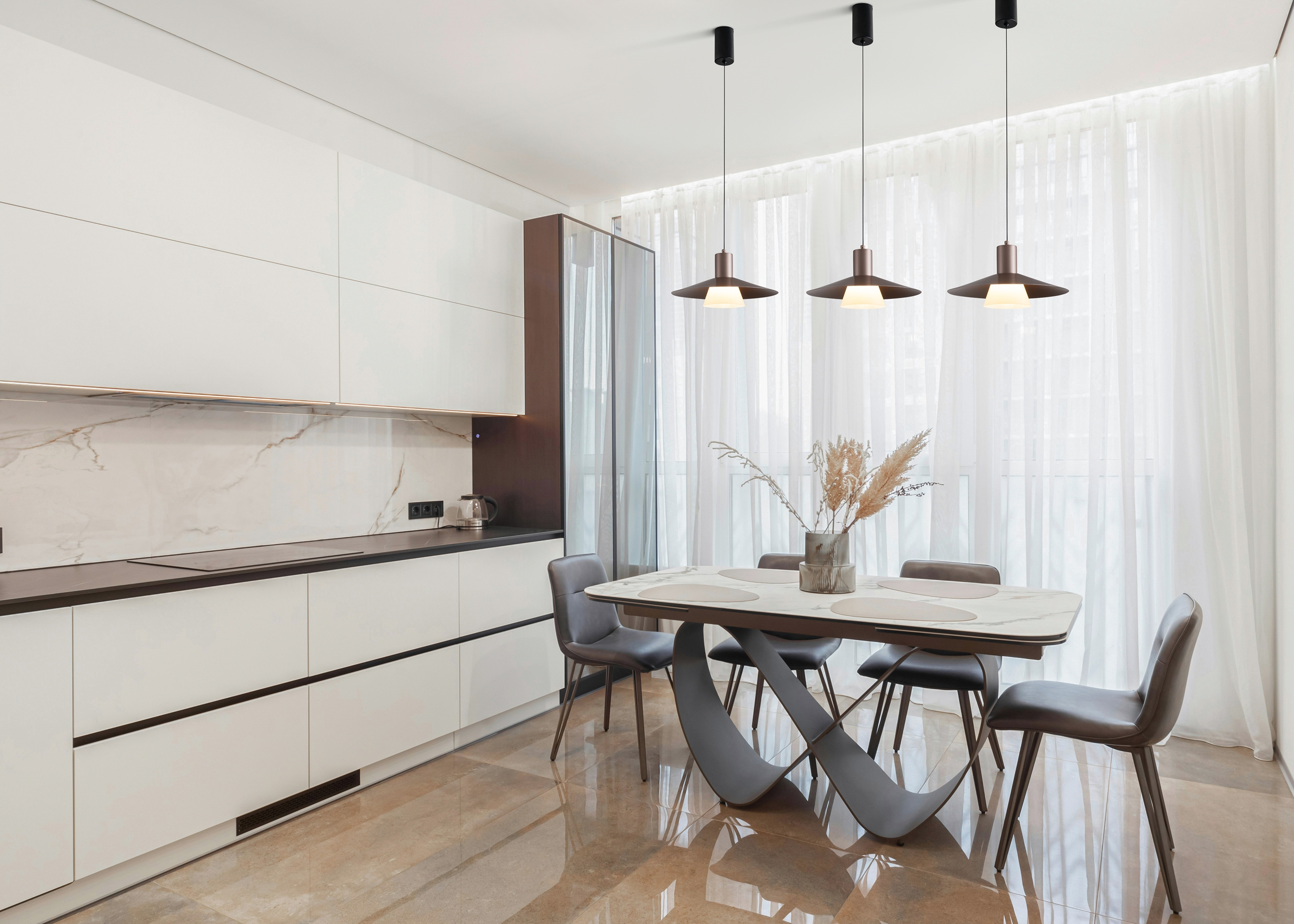 Арматура - металл. LED источник света (4000K). Подвесные светильники и бра настенные в золотом матовом оттенке плафонов и арматуры. Трансформируемые плафоны создают эффект аутдора.