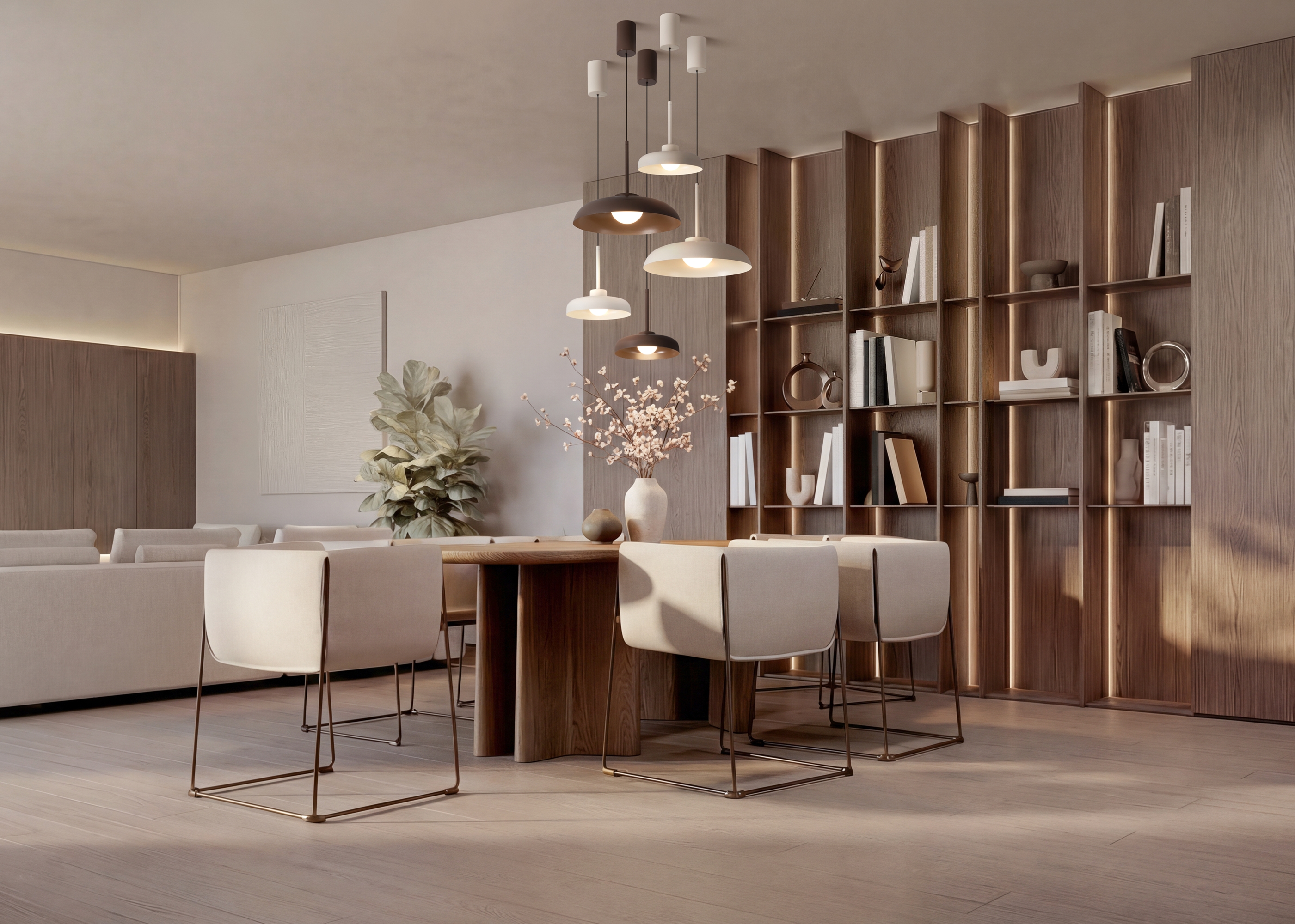 Арматура — металл цветов (RAL 9001) и (RAL 8025). Интегрированный LED источник света 2700-4000К, Ra 80, угол 120°. Лифтовый механизм регулировки высоты у подвесных моделей.