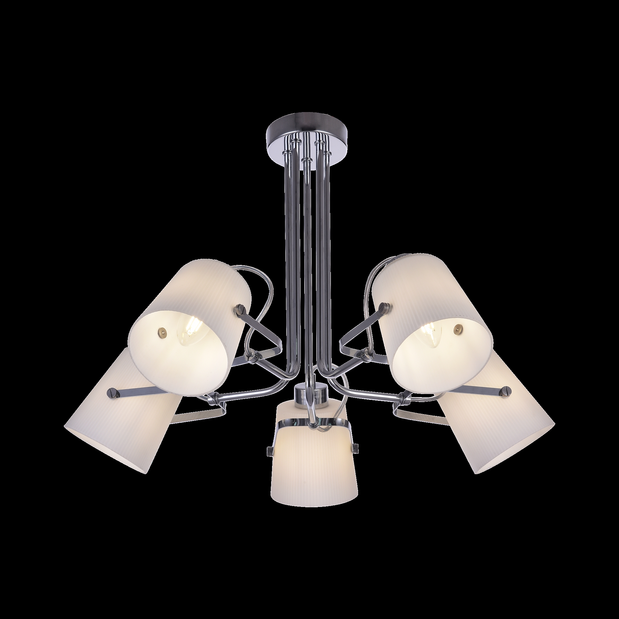 Современные светильники в стиле хай-тек. Арматура сделана из металла, а плафоны – из рельефного белого стекла. Благодаря специальному механизму можно менять направление света, поворачивая плафоны. Небольшая высота светильников делает их хорошим решением для интерьеров с невысокими потолками.