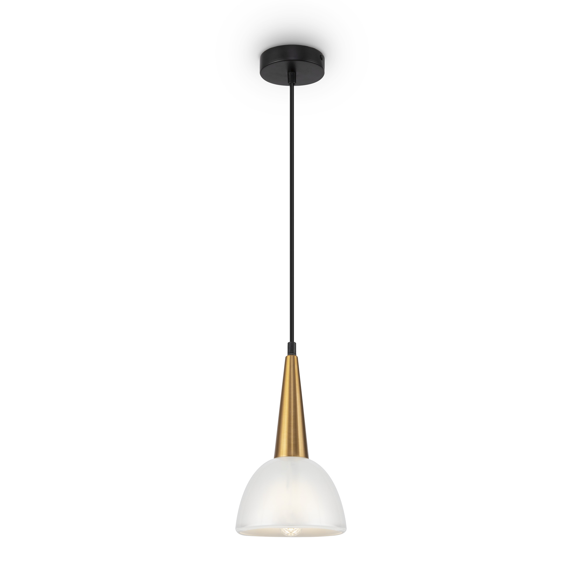 Лаконичный дизайн серии Noria с ретро-настроением идеален для зональной подсветки современных интерьеров. Металлическая арматура светильника окрашена в черный и золотой цвет – классический дуэт, актуальный для любой интерьерной палитры. Широкий плафон выполнен из белого стекла. Он обеспечивает равномерное и мягкое распределение светового потока. Такое освещение отлично подойдет для зон отдыха в гостиной, создаст уютную атмосферу в кафе и ресторанах. Плавные, обтекаемые формы придают светильнику визуальной легкости. Современный подвес без труда интегрируется в различные стили: лофт, минимализм, скандинавский, эклектика, техно.