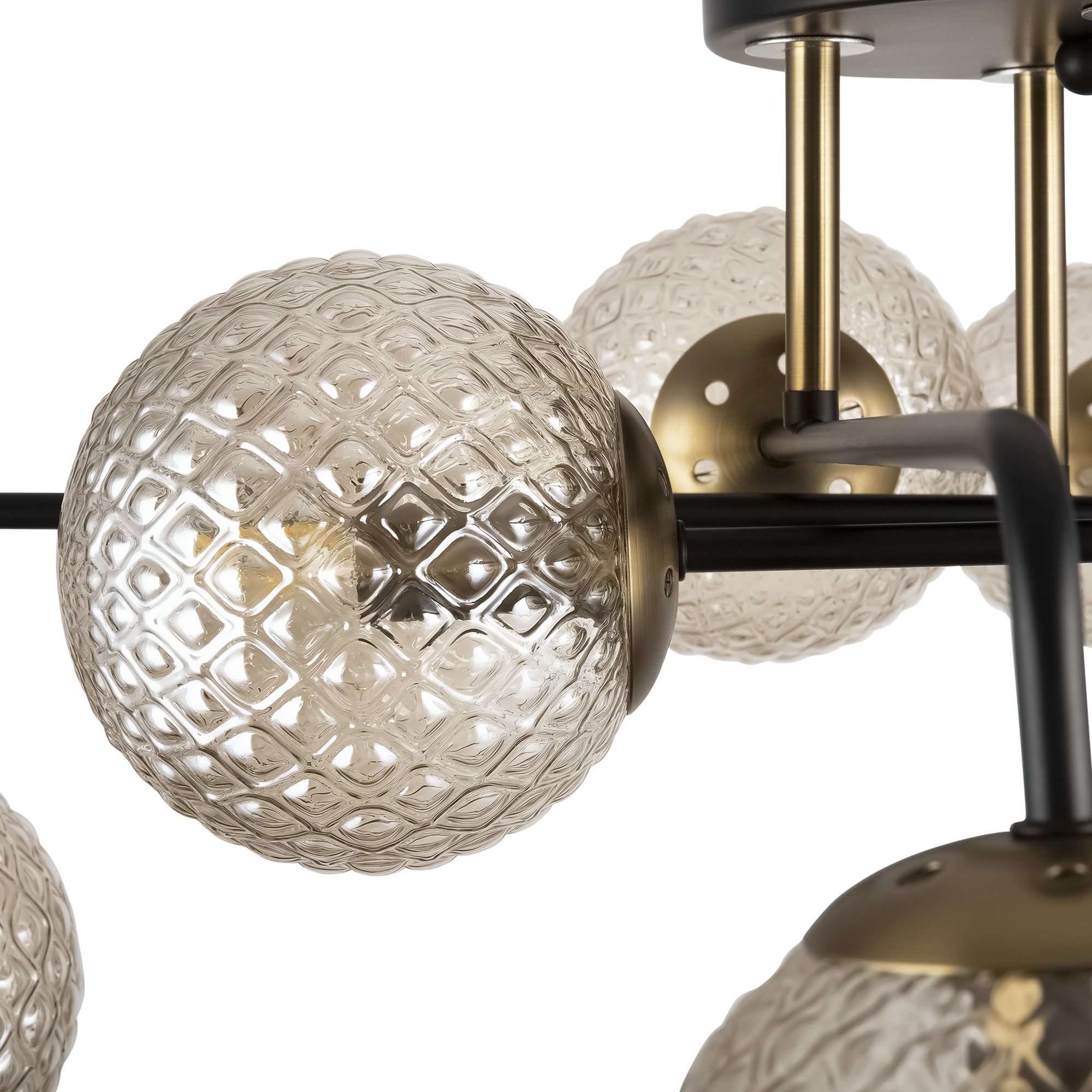 Минималистичный дизайн серии Navel добавит современным интерьерам динамичности. Графичные линии, отсутствие лишнего декора и прозрачные плафоны обеспечивают светильникам визуальную легкость: их можно использовать как в просторных студиях, так и в маленьких помещениях. Металлическая арматура сочетает черный цвет и благородный оттенок латуни – дуэт, актуальный для большинства цветовых решений интерьера. Округлые плафоны-сферы, выполненные из янтарного стекла, имеют трендовую фактурную поверхность. Такое решение создает легкую игру света и теней, добавляет дизайну изюминку. Компактные потолочные люстры на 6 и 8 плафонов подойдут для комнат с невысокими потолками, а стильное бра идеально завершит световой ансамбль. Серия хорошо адаптируется в интерьерах, выполненных в стиле лофт, сканди, минимализм, mid-century modern.