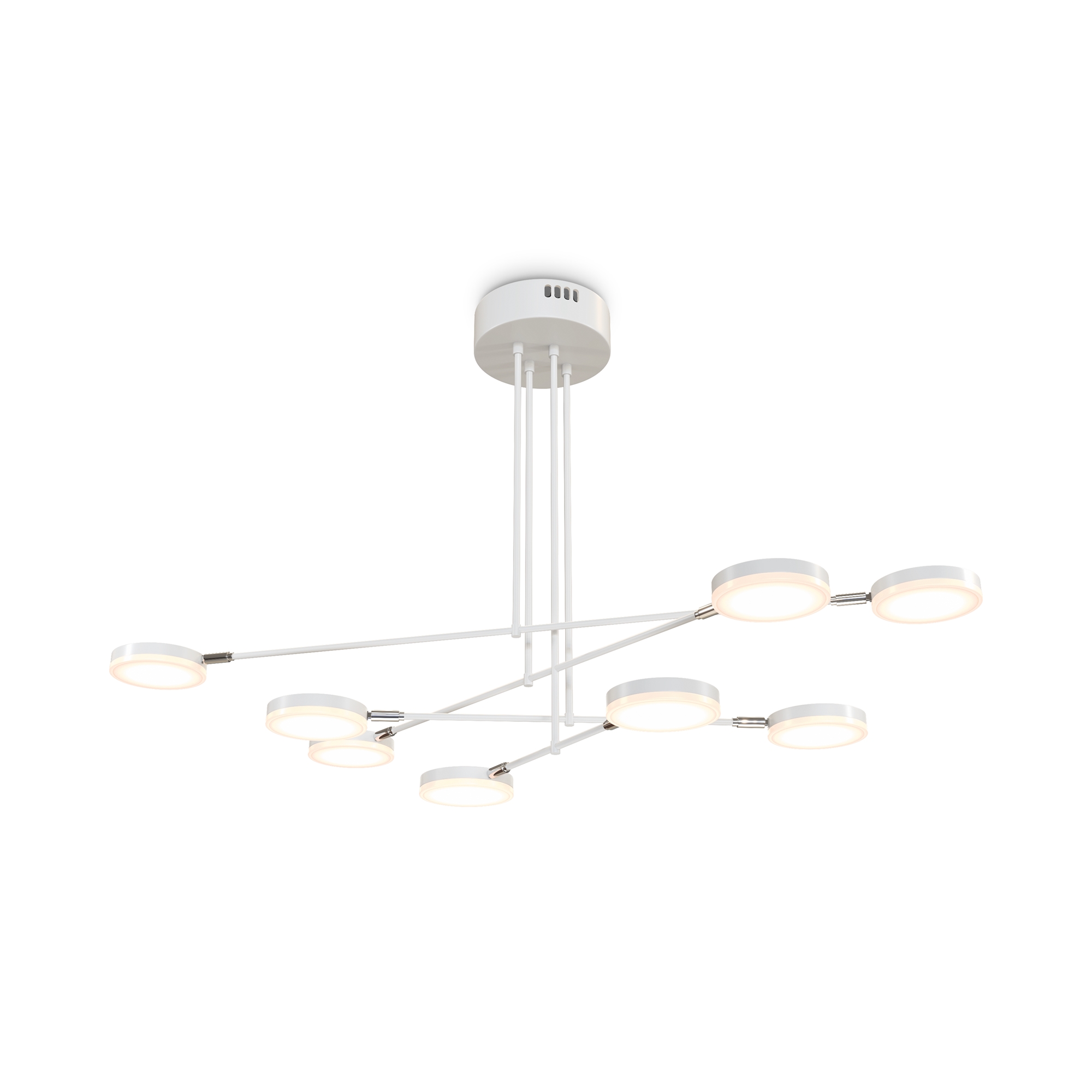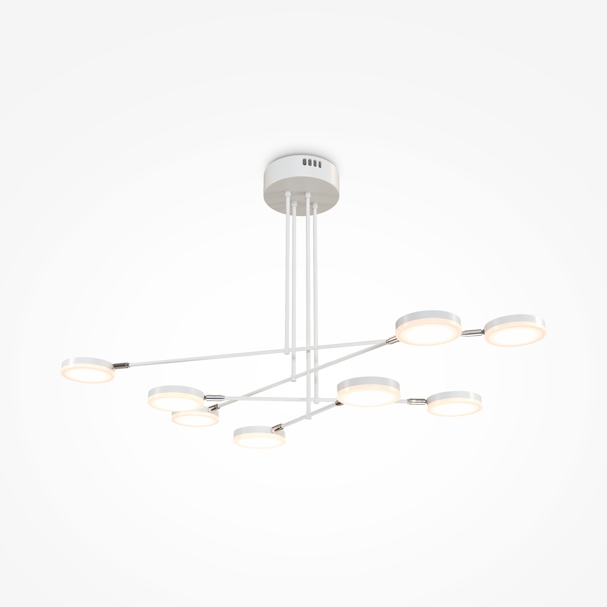 Плафоны и арматура из металла. Цвет рассеивателя — белый, арматура черная или белая. Конструкция предусматривает шарнирный механизм, позволяющий регулировать направление света и высоту светильников. Плафоны вращаются на 90 и 360° (в вертикальной и горизонтальной плоскостях). Угол рассеивания — 120 градусов. Тип света — рассеянный.
