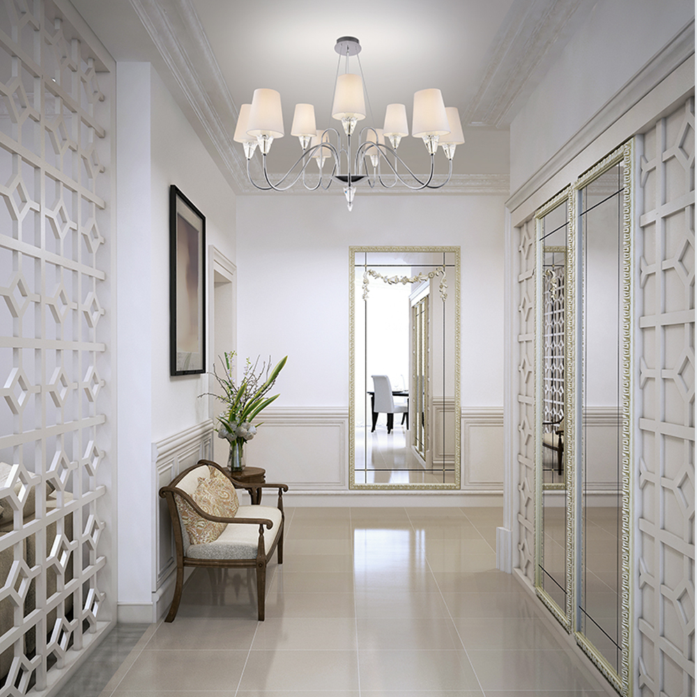 Массивный декор стеклянных граней выделяет светильники этой серии среди других моделей. Хромированную металлическую арматуру мягко оттеняют белые хлопковые абажуры. Рассеивая свет, они дарят уютное, атмосферное освещение. Классическая грациозность светильников выражена в элегантных изгибах рожков и подчеркнутой гармонии оттенков. Серия включает регулируемую по высоте подвесную люстру на 12 и 9 плафонов, две настольные лампы, а также бра на один и три плафона.