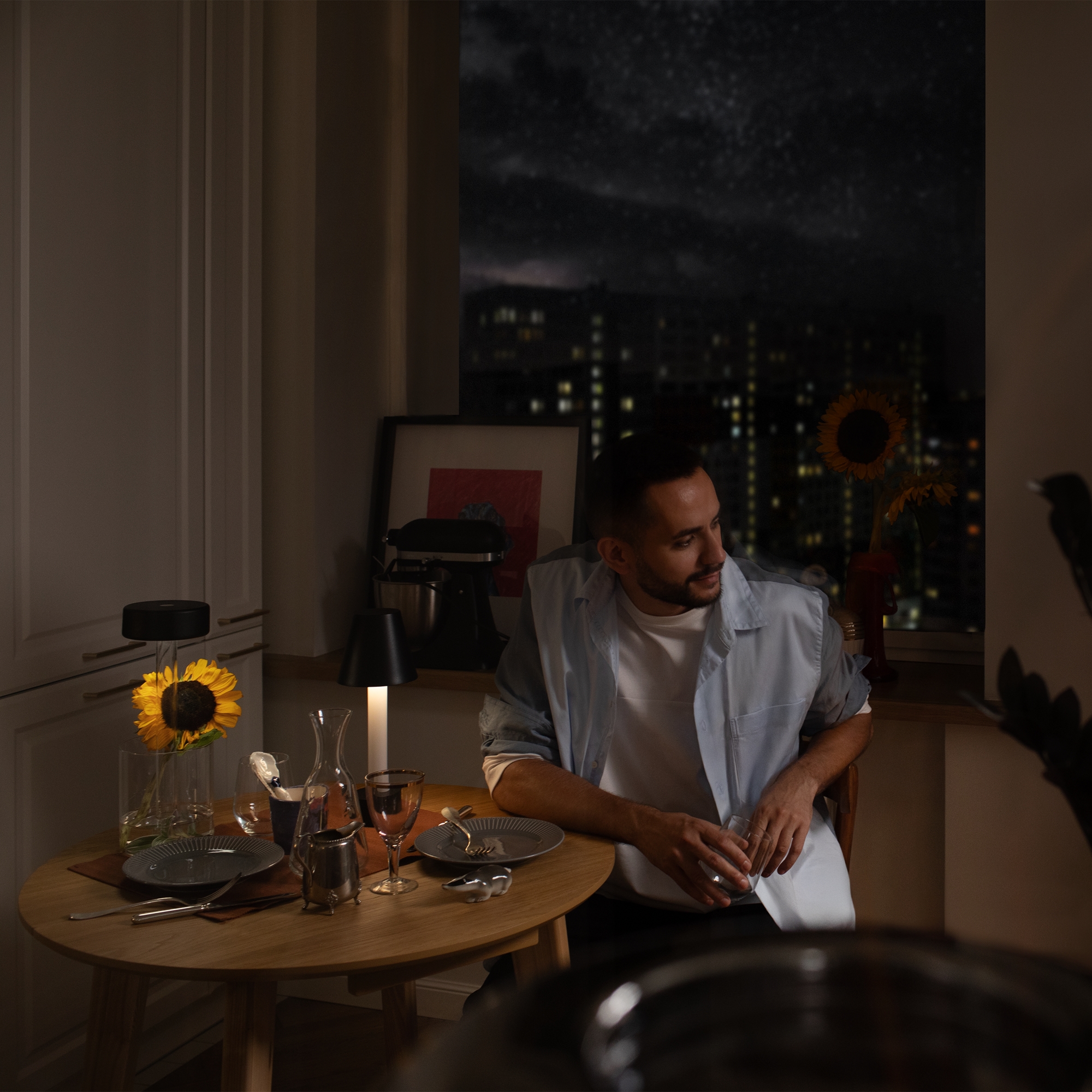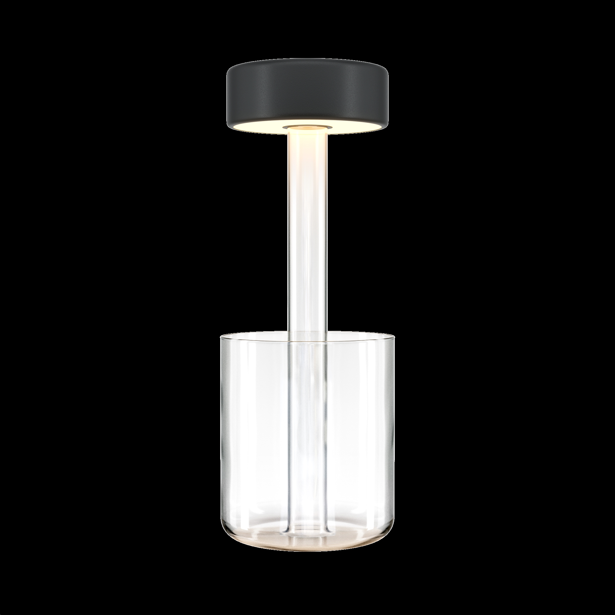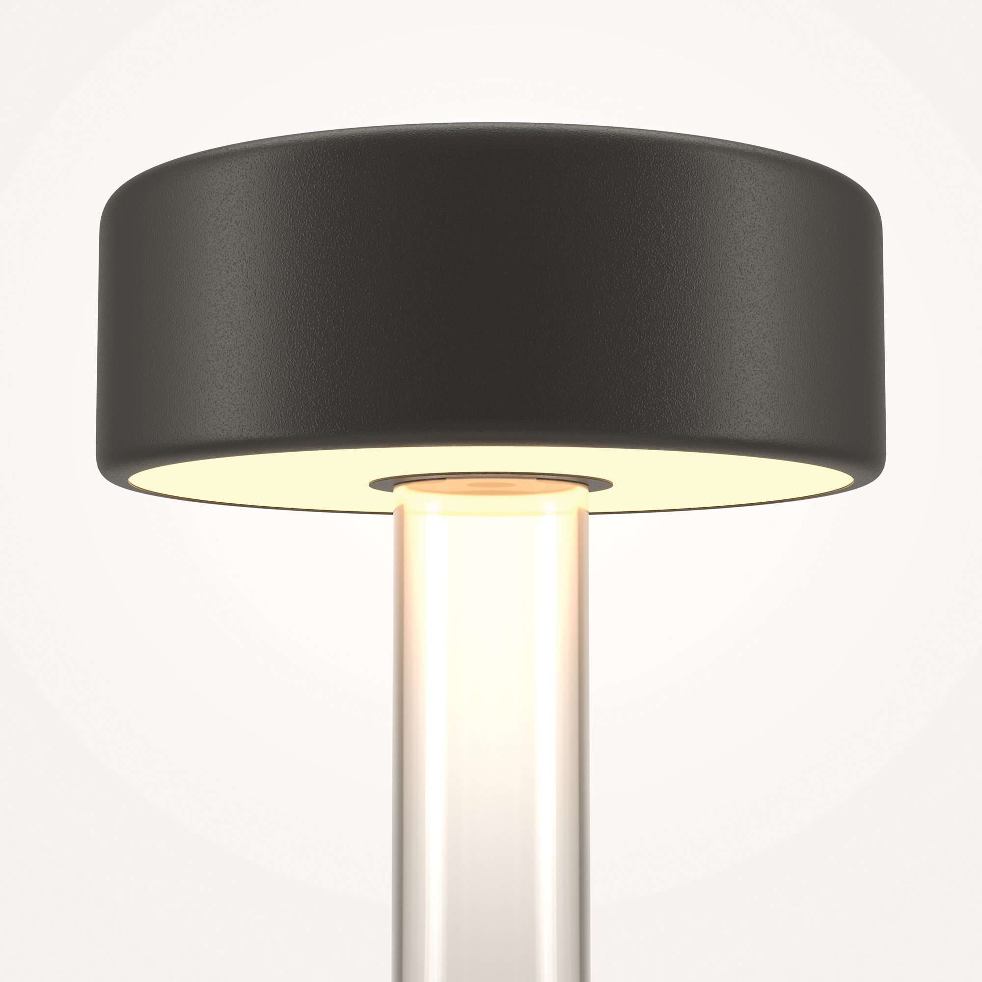 Портативный настольный светильник. Результат творческой коллаборации искусственного интелекта и предметного дизайнера. Два варанта корпуса светильника: с металлической тонкой ножкой на плоском круглом основании; со стеклянным основанием с интегрированным в него вазой. Плафон снимается с основания для удобного ухода за стеклянными элементами и подзарядки аккумулятора, расположенного в плафоне. Два варианта цвета стеклянных моделей - прозрачный и серый. Плафоны с рассеивателем из акрила в 3х цветах: черный, золотой, белый. Удобный сенсорный выключатель вверху плафона. Micro USB разъем для подзарядки скрыт в нижней части плафона. LED-источник света. Регулируемая цветовая температура от 2200К до 4000К.