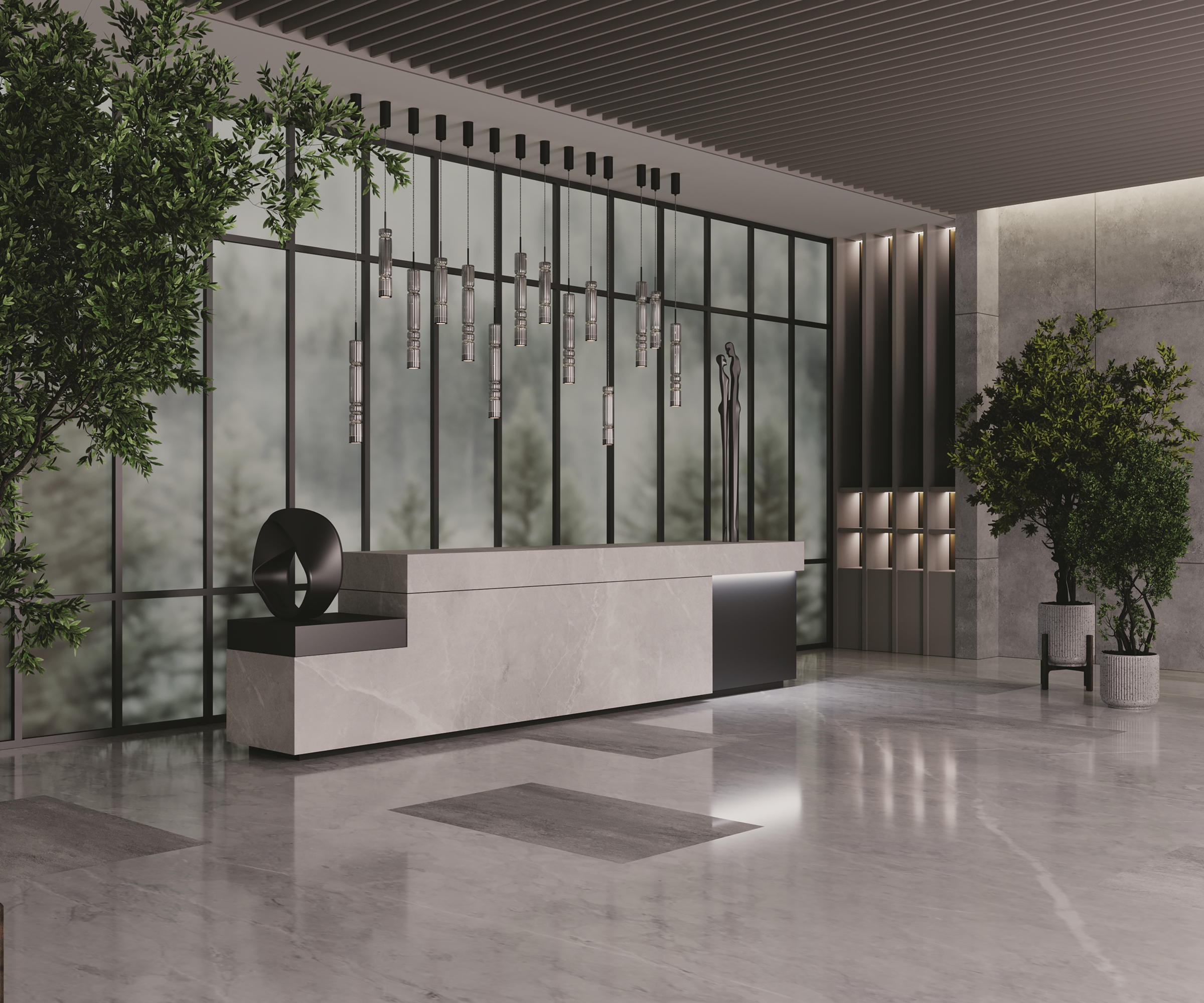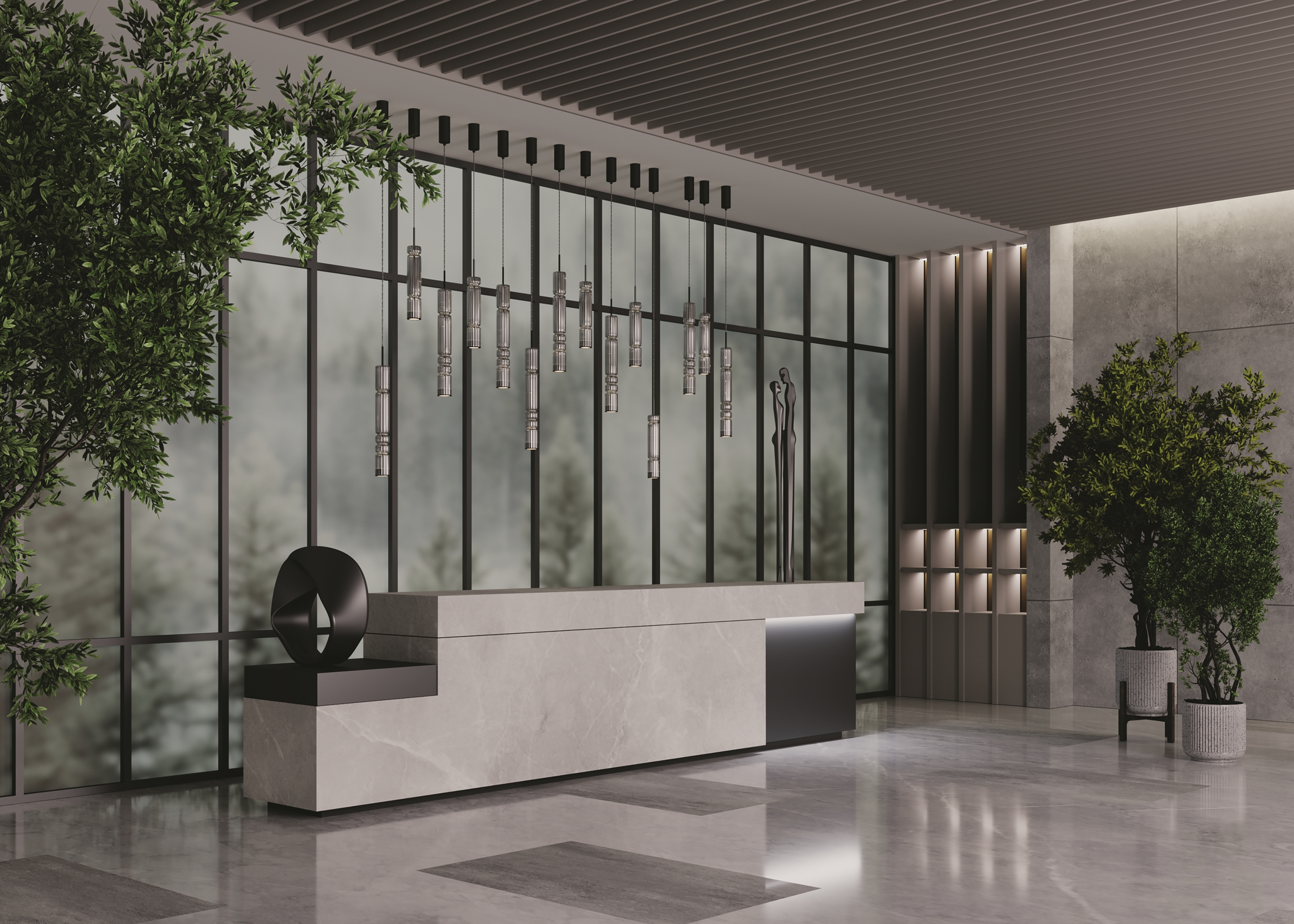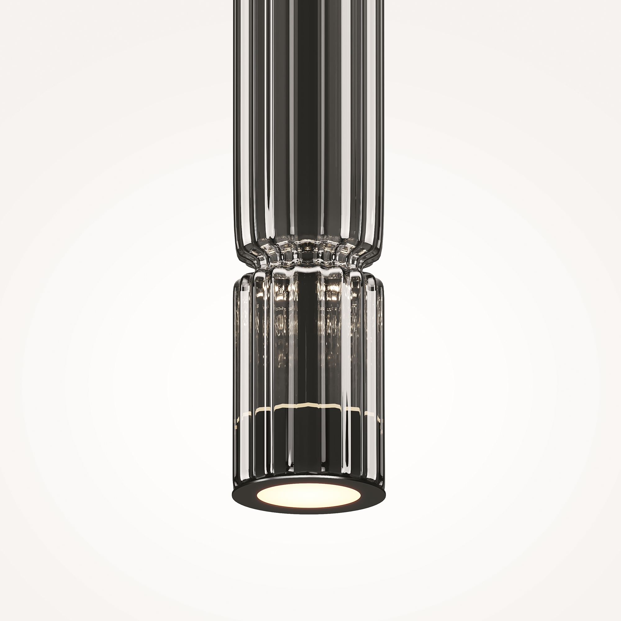 Арматура - металл, цвет - хром, черный. Цилиндрические плафоны из стекла с вертикальным рельефным рисунком в трех оттенках: прозрачный, коньячный, дымчатый. Метафора древнегреческих храмовых колонн в образе светильников. LED-источник света. Цветовая температура 3000К.