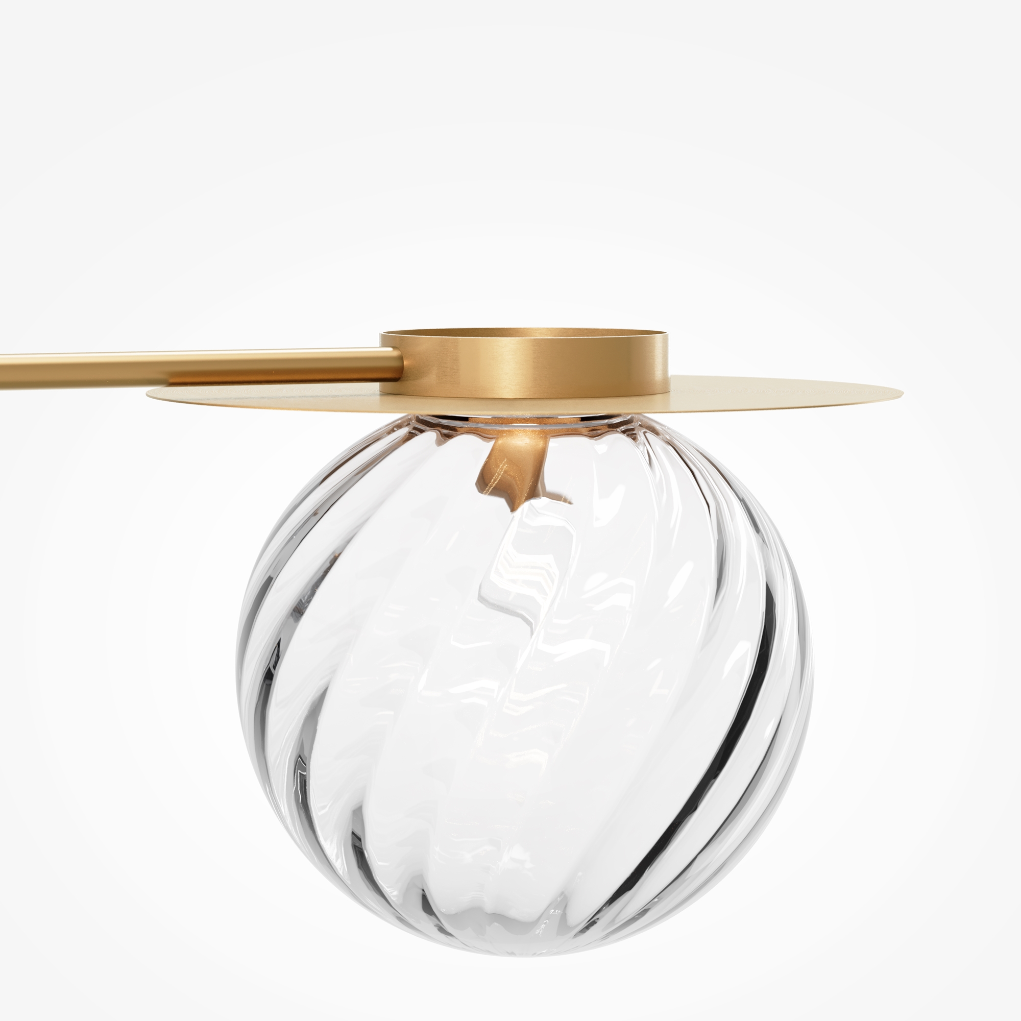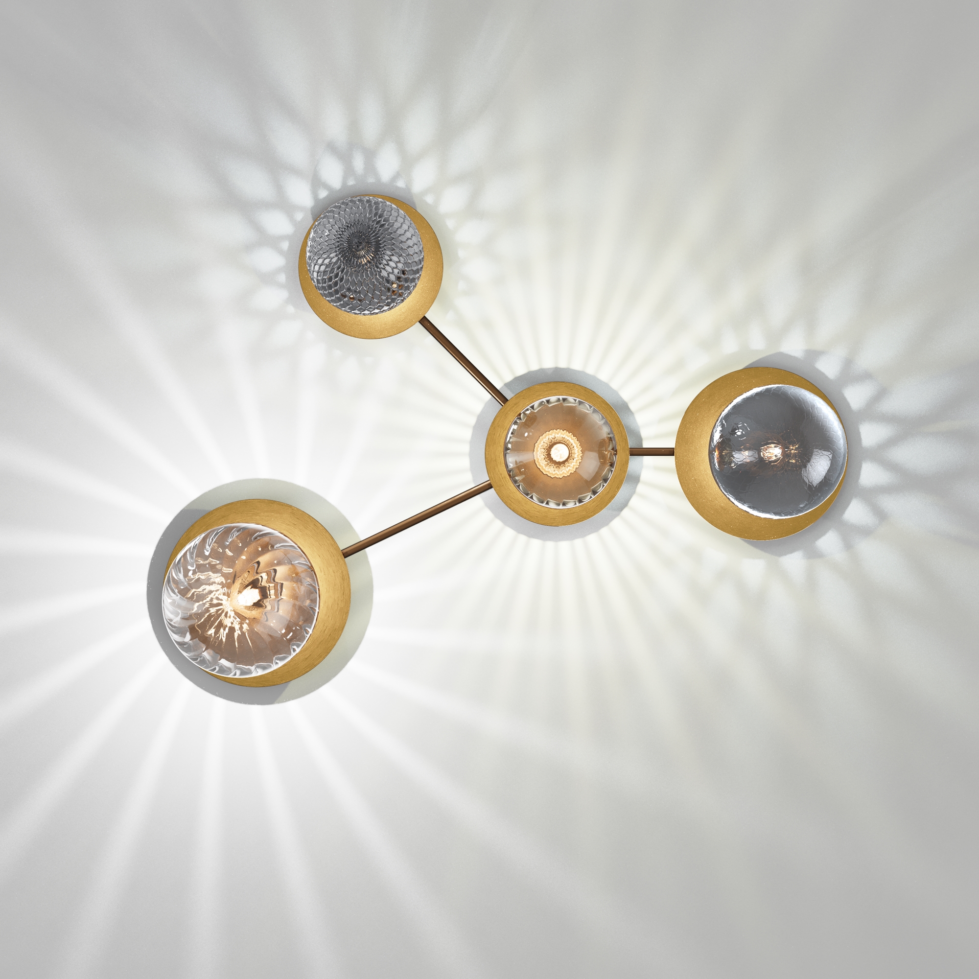 Компактное металлическое основание и арматура цвета латуни. Две модели с плафонами белого цвета и две с разноцветными плафонами: серый, прозрачный, дымчатый и оттенка коньяка. Источник света: цоколь Е14. Компактное основание светильника прилегает к потолку. Функциональное основное освещение. Местоположение разноцветных плафонов можно менять, создавая композиции по своему вкусу. Поверхность плафонов имеет орнамент, при включении светильника на потолке создаются узоры.