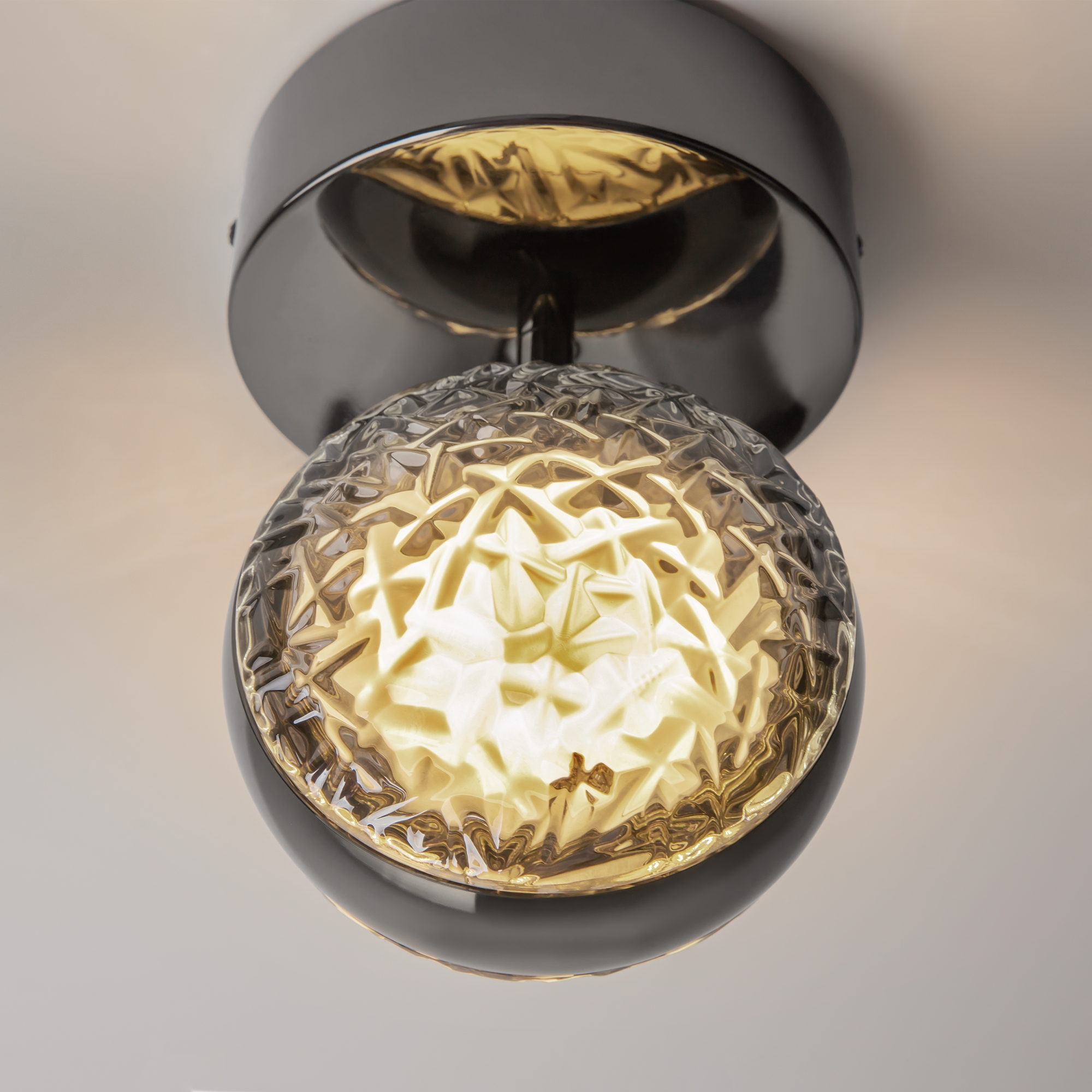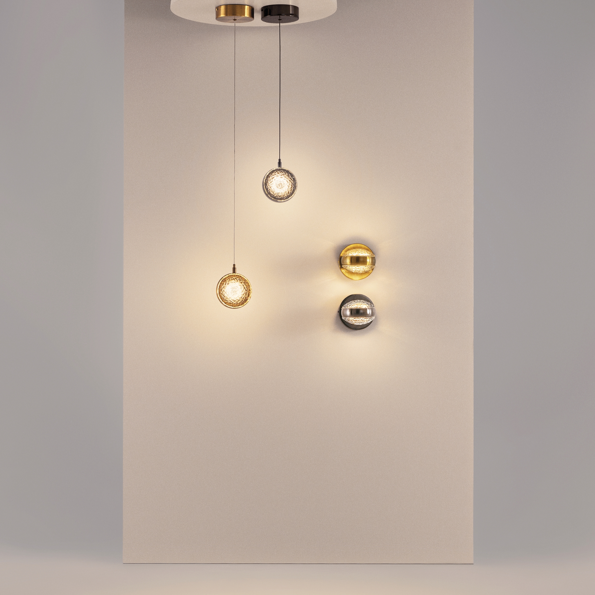 Два цветовых сочетания: сатинированная арматура из металла в цвете латунь в комбинации со стеклянными плафонами янтарного оттенка или трендовый черный хром с глянцевым финишем в сочетании с тонированными светло-серыми плафонами. Источник света: LED. Цветовая температура 3000К, угол рассеивания 120 градусов. Провод длиной 3 м можно регулировать по высоте — светильник подходит для помещений с высокими потолками.