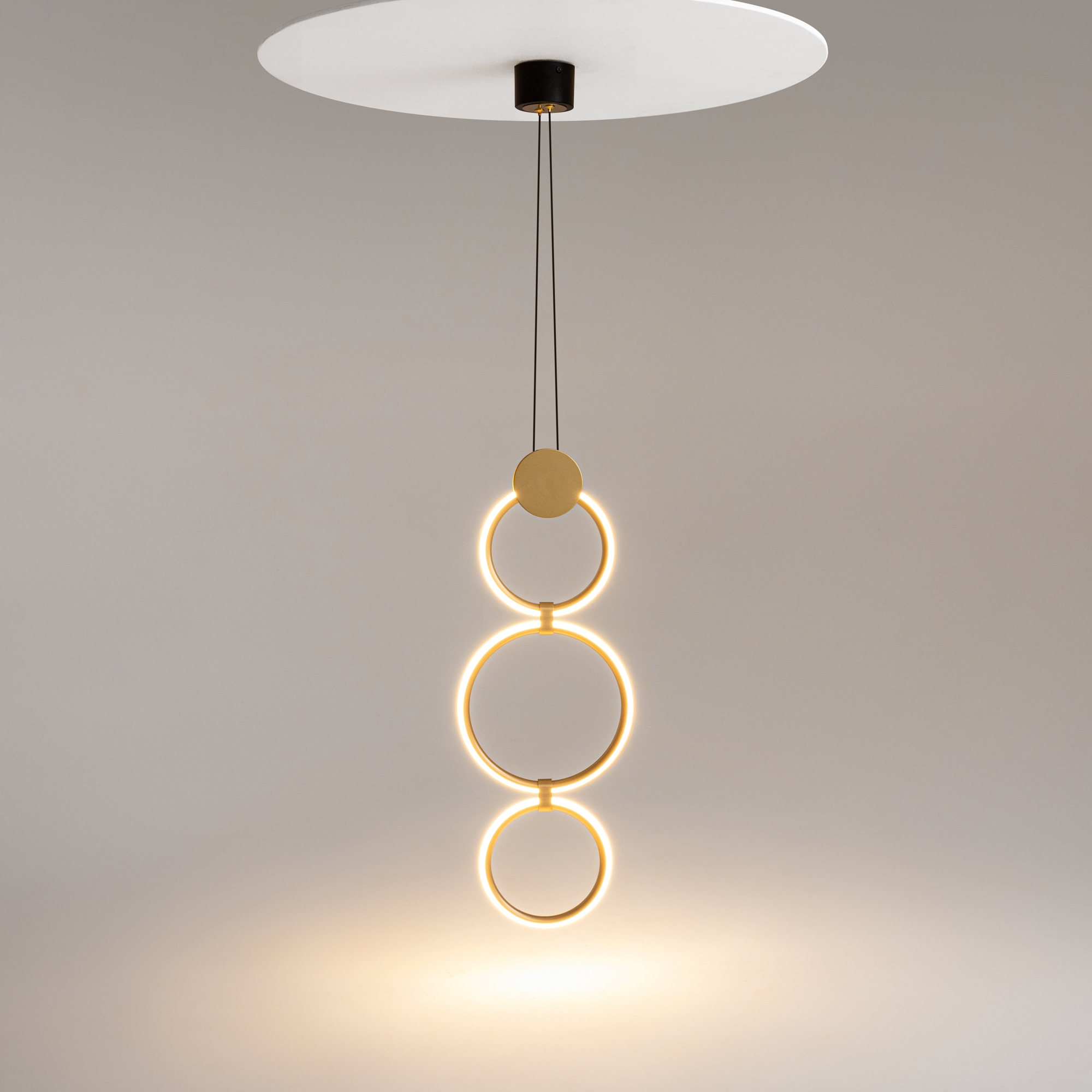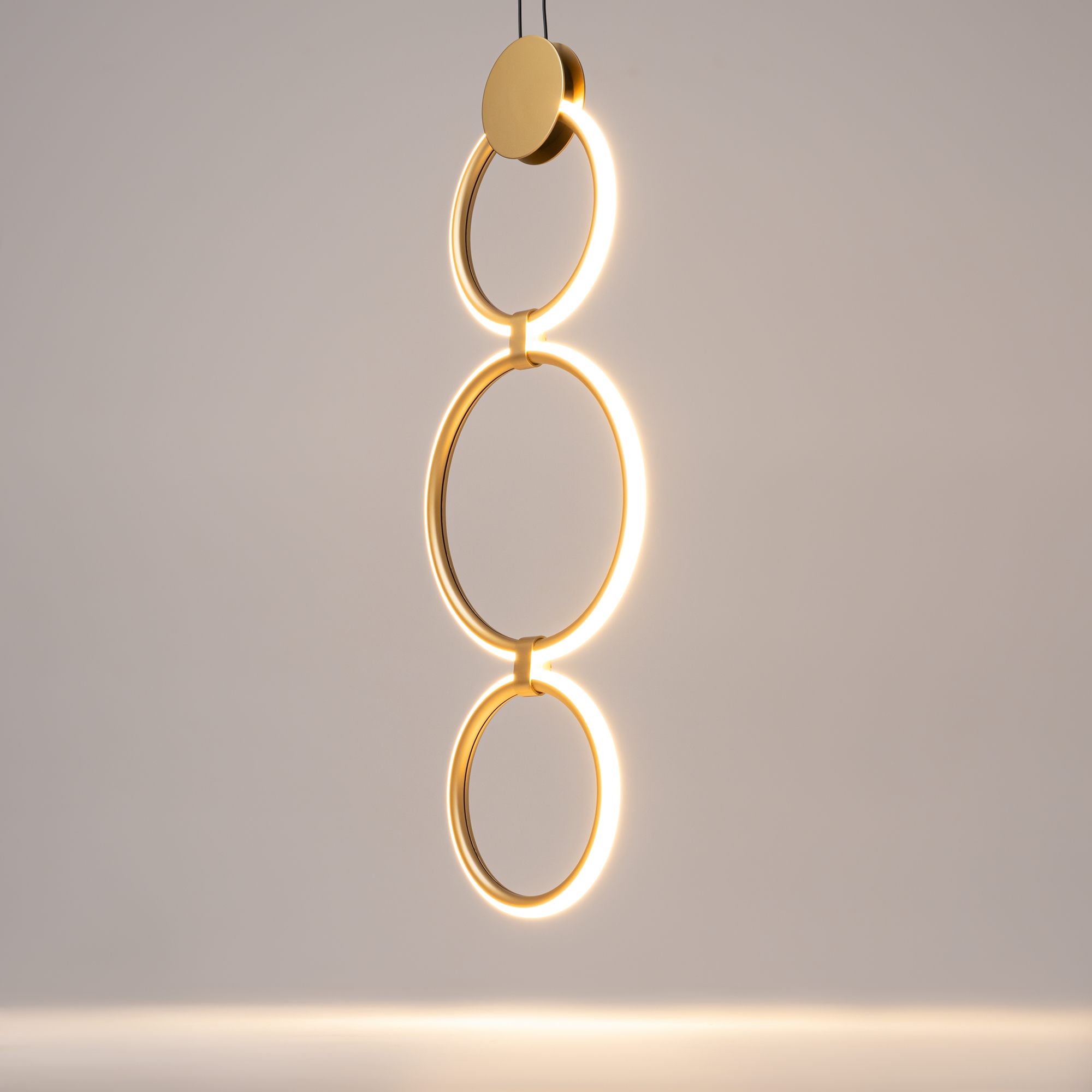 Серия Link представлена подвесными и настенными светильниками с разной вариацией светодиодных колец. Арматура - из металла в цвете латунь с чёрными элементами. Источник света — LED-кольца. Цветовая температура — 3000 K. Угол рассеивания — 125 градусов. Провод регулируемый, 3 метра.