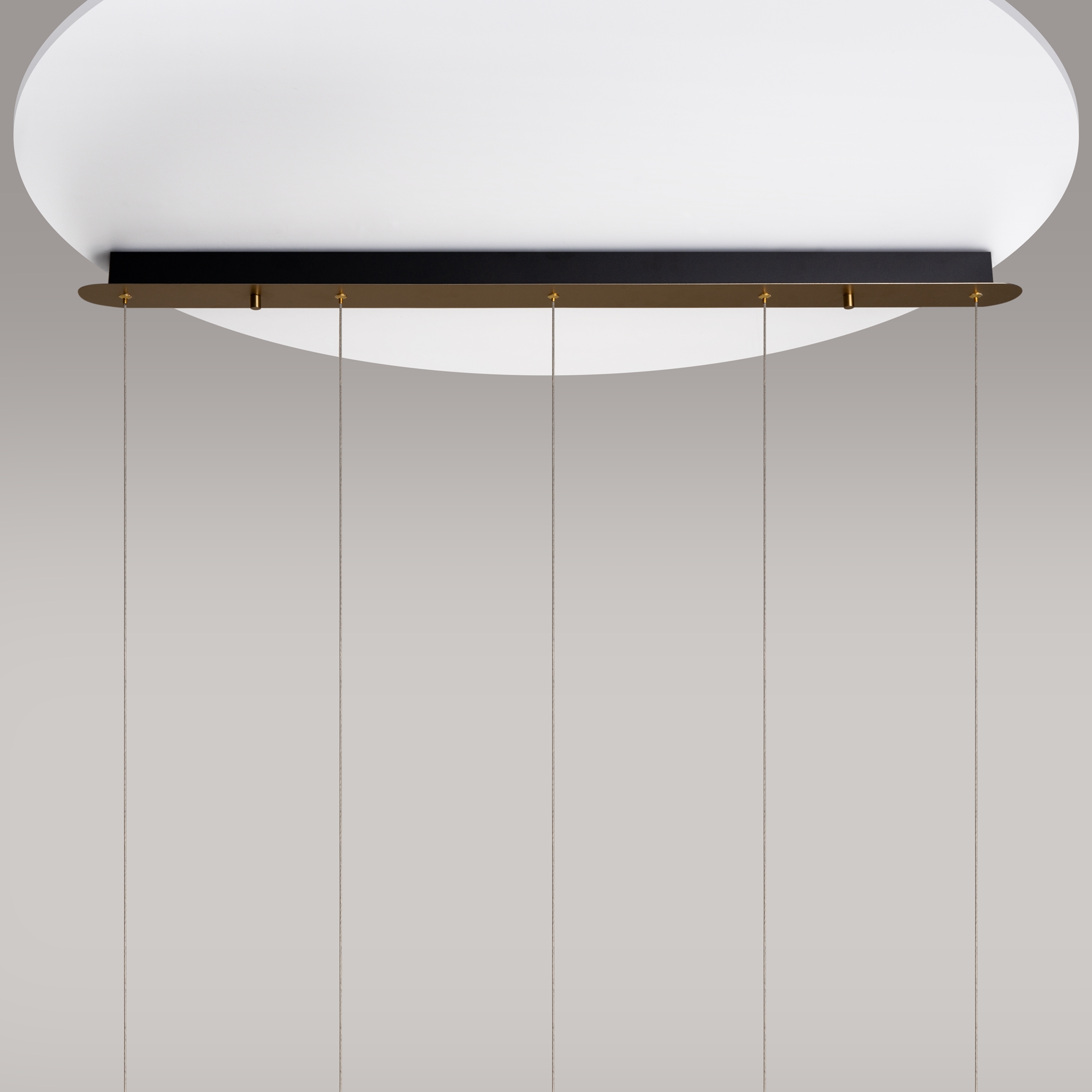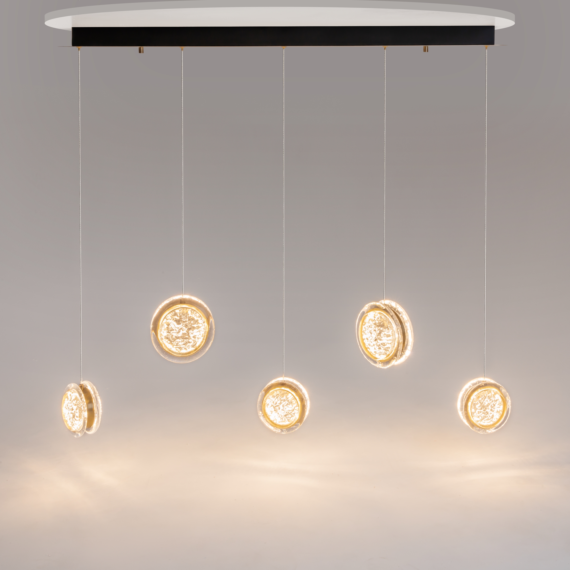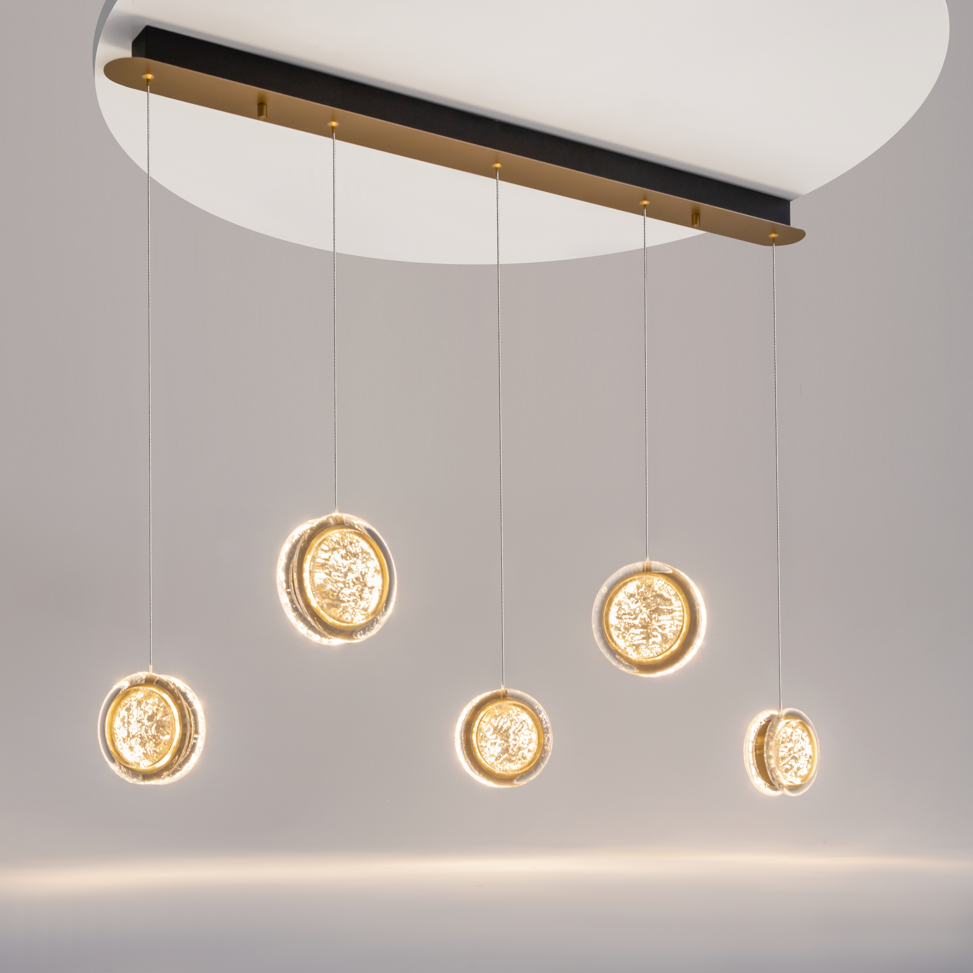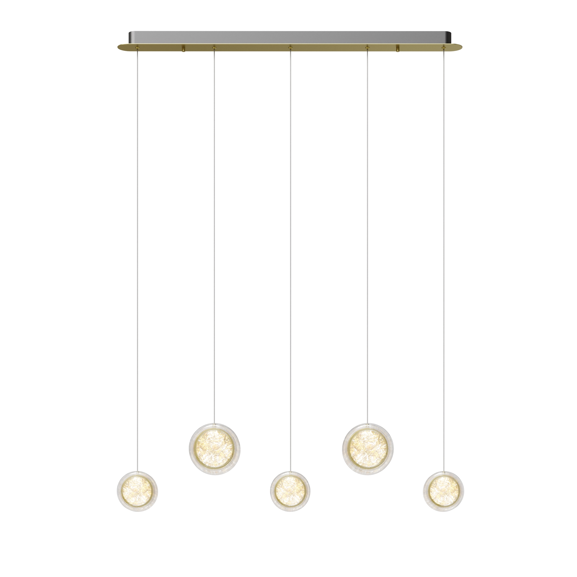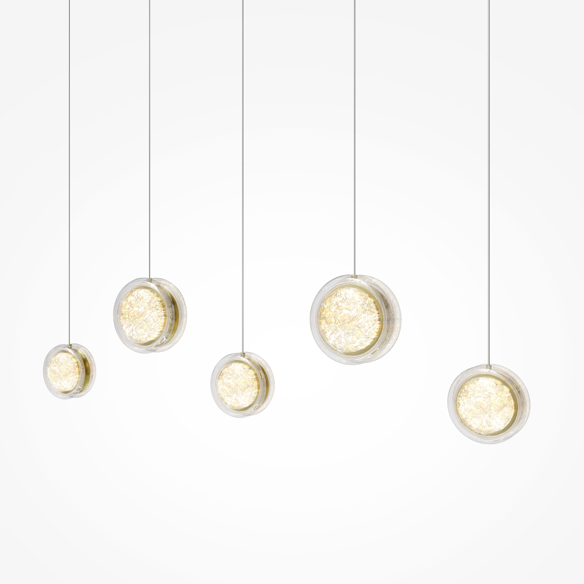 Арматура из металла цвета латунь с сатинированным финишным покрытием сочетается с прозрачными плафонами. Подвесные одинарные, горизонтальный и каскадные светильники оснащаются LED-модулем с двумя плоскими плафонами из акрила со сложным, актуальным паттерном на поверхности. Цветовая температура — 3000К, угол рассеивания — 125 градусов.