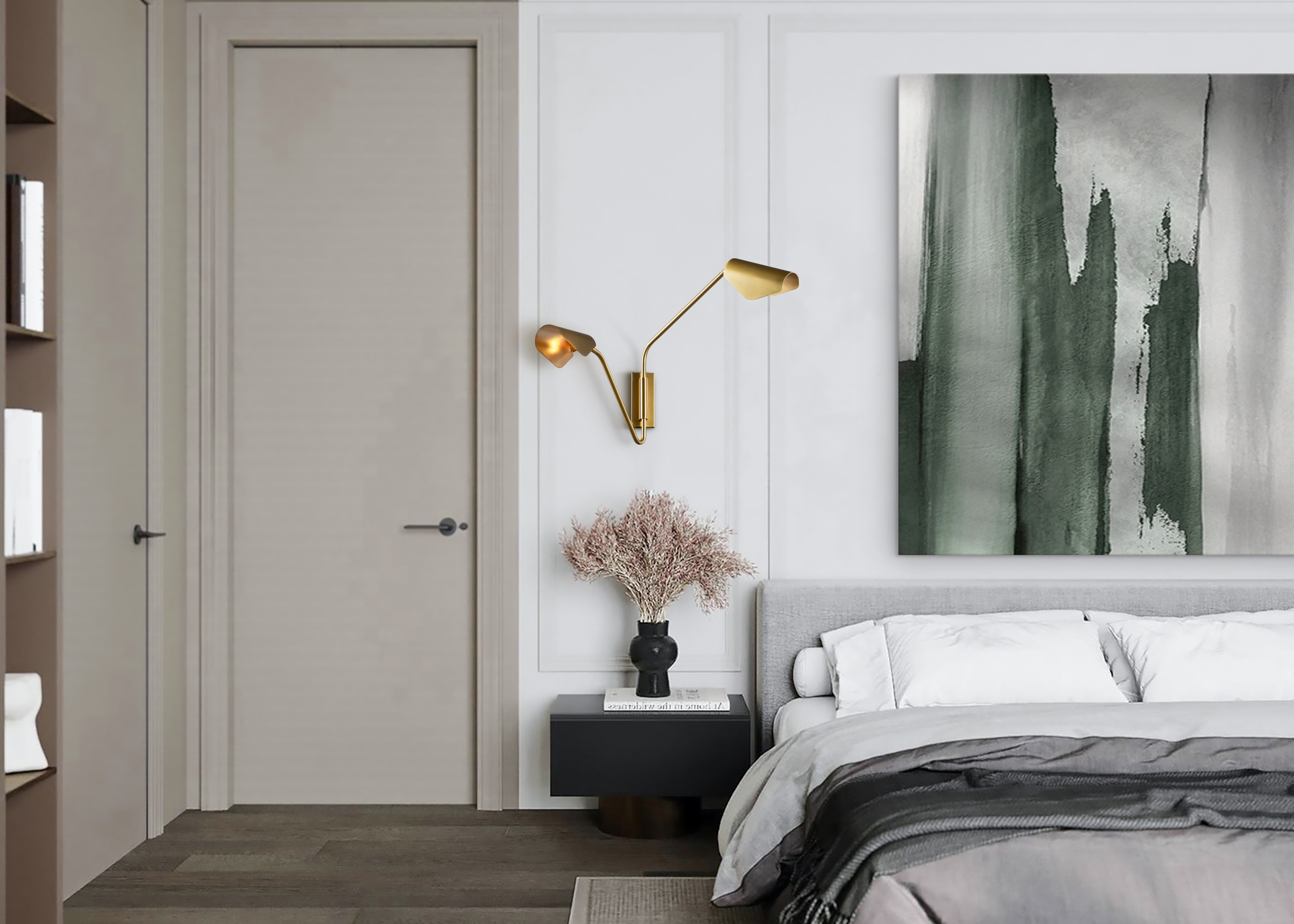 Металлическая арматура в трех оттенках: латунь, матовый черный, матовый белый. Оригинальная геометрия в дизайне. Двунаправленный световой поток: вверх и вниз. Компактные размеры. Акцентная подсветка.