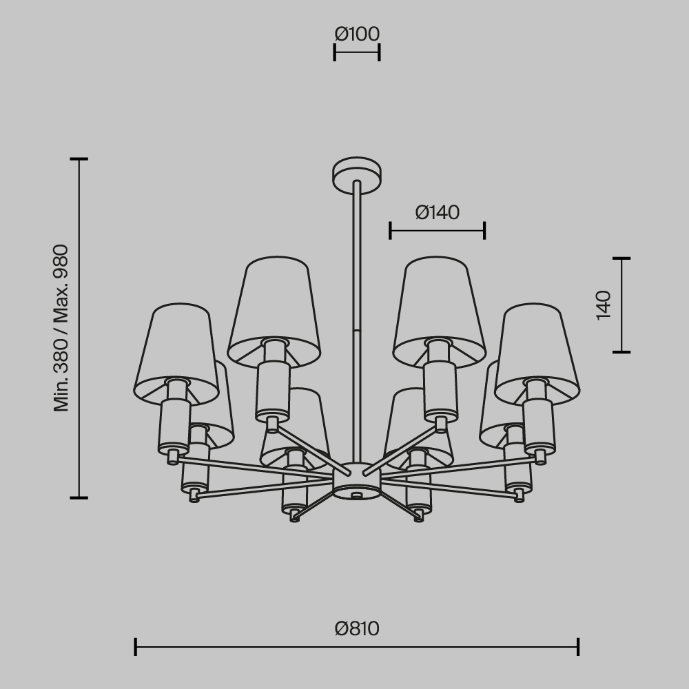 Серия включает подвесные (6 и 8 рожков), настенные, настольные и напольные светильники. Арматура: металл цвета сатинированной латуни с декоративными элементами из серого мрамора. Абажуры: текстиль. Сменный источник света с цоколем E14. Высота подвесных светильников регулируются сегментами штанги. Классический дизайн в современном исполнении. Предназначены для основного и акцентного освещения жилых помещений. Универсальное применение: гостиные, столовые, спальни, кабинеты, прихожие.
