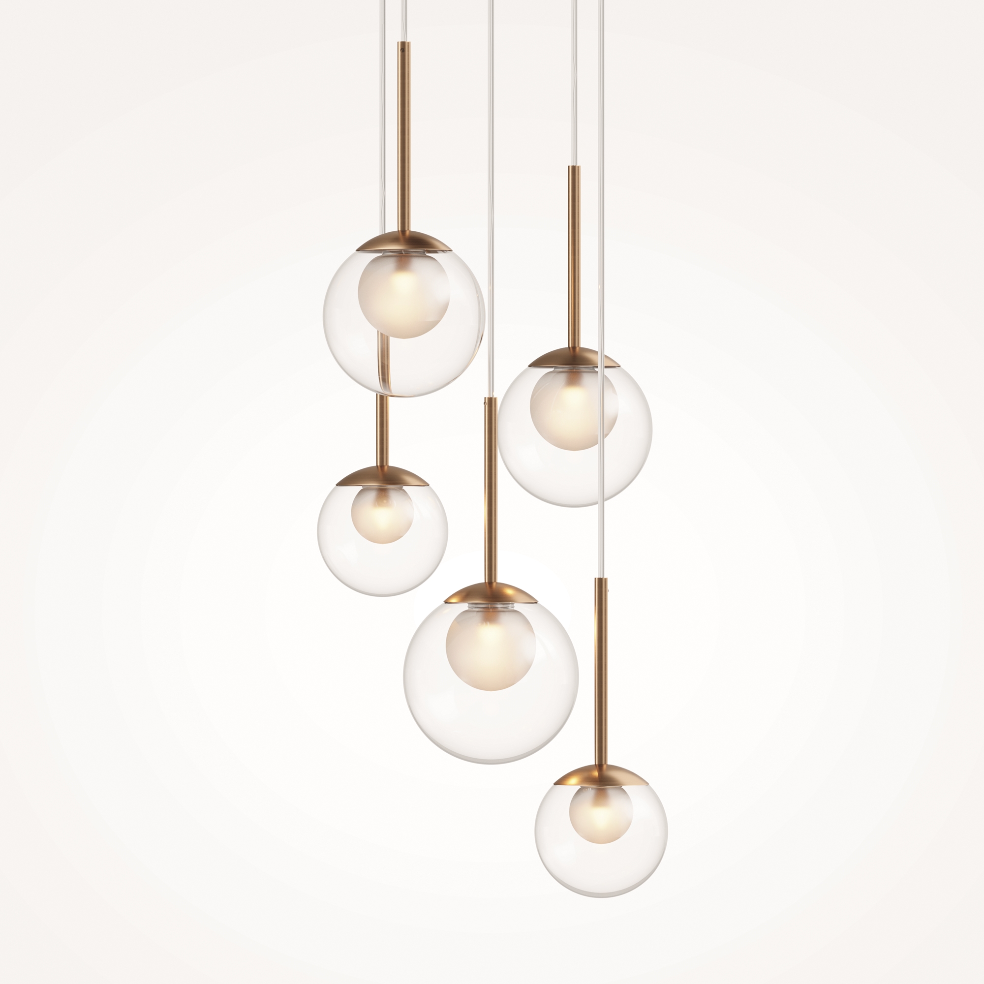 Материал арматуры – металл, цвет - золото, белый, черный. Округлые плафоны из матового белого стекла. Универсальные формы, минималистичный дизайн. Цоколь - E14. Лампы не входят в комплект. Регулируемая высота подвесных светильников.