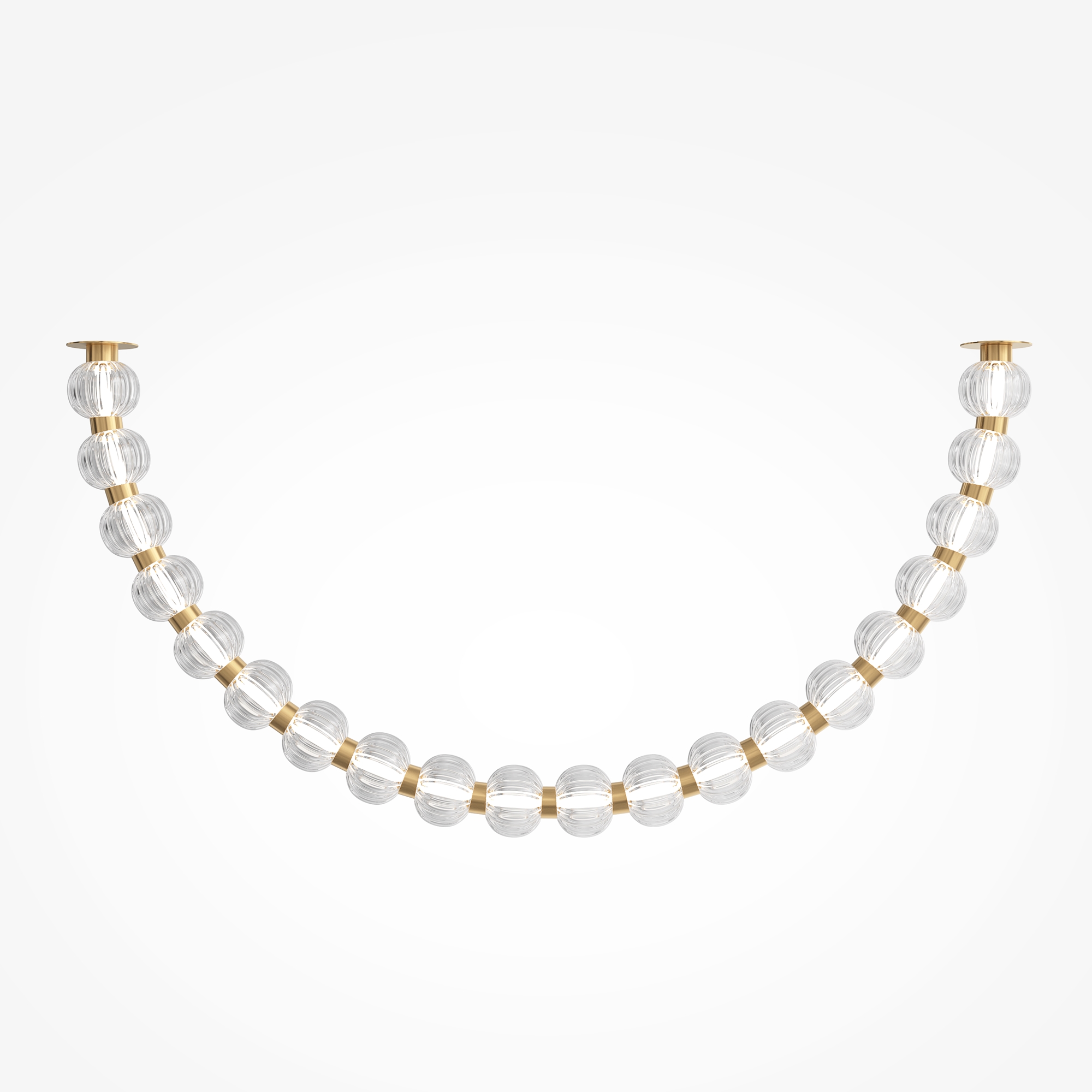 Арматура из металла, цвет – хром. Акцентный декор в виде рельефных сфер из литого стекла. Источник света – светодиодная лента – скрыта под акриловым рассеивателем. Регулируемая высота подвесных светильников.