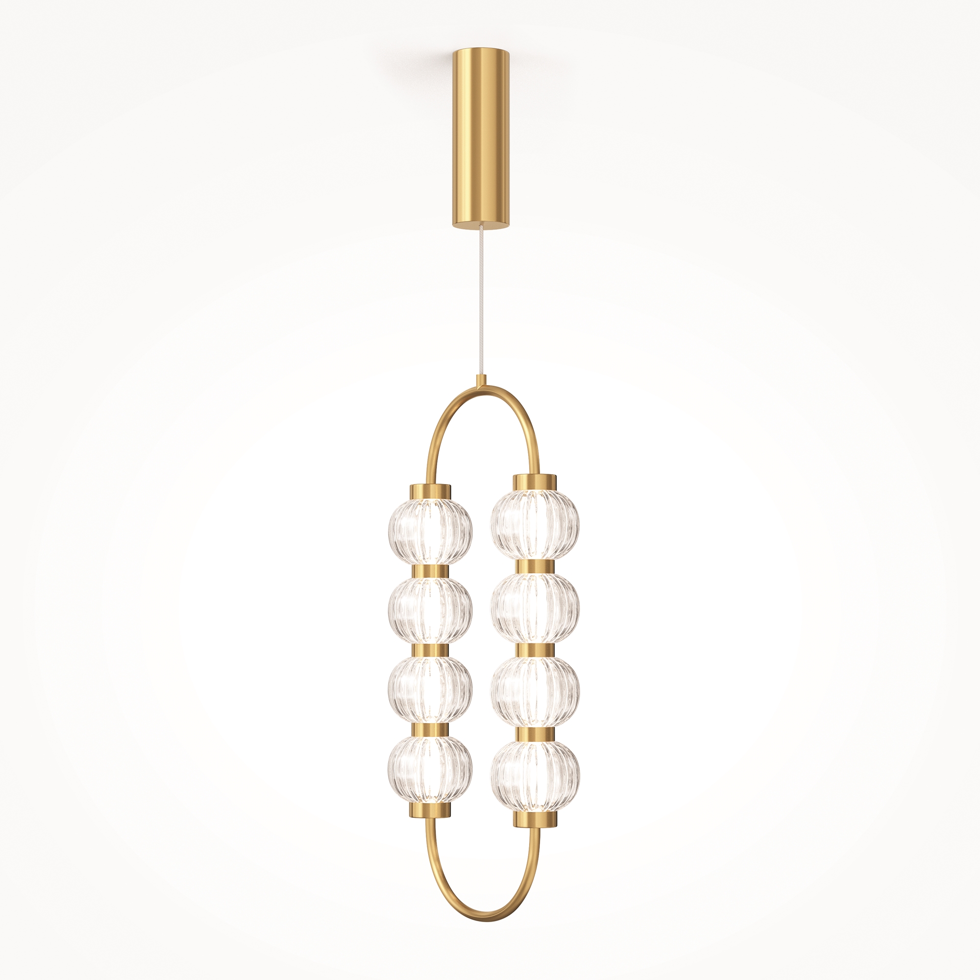 Арматура из металла, цвет – хром. Акцентный декор в виде рельефных сфер из литого стекла. Источник света – светодиодная лента – скрыта под акриловым рассеивателем. Регулируемая высота подвесных светильников.