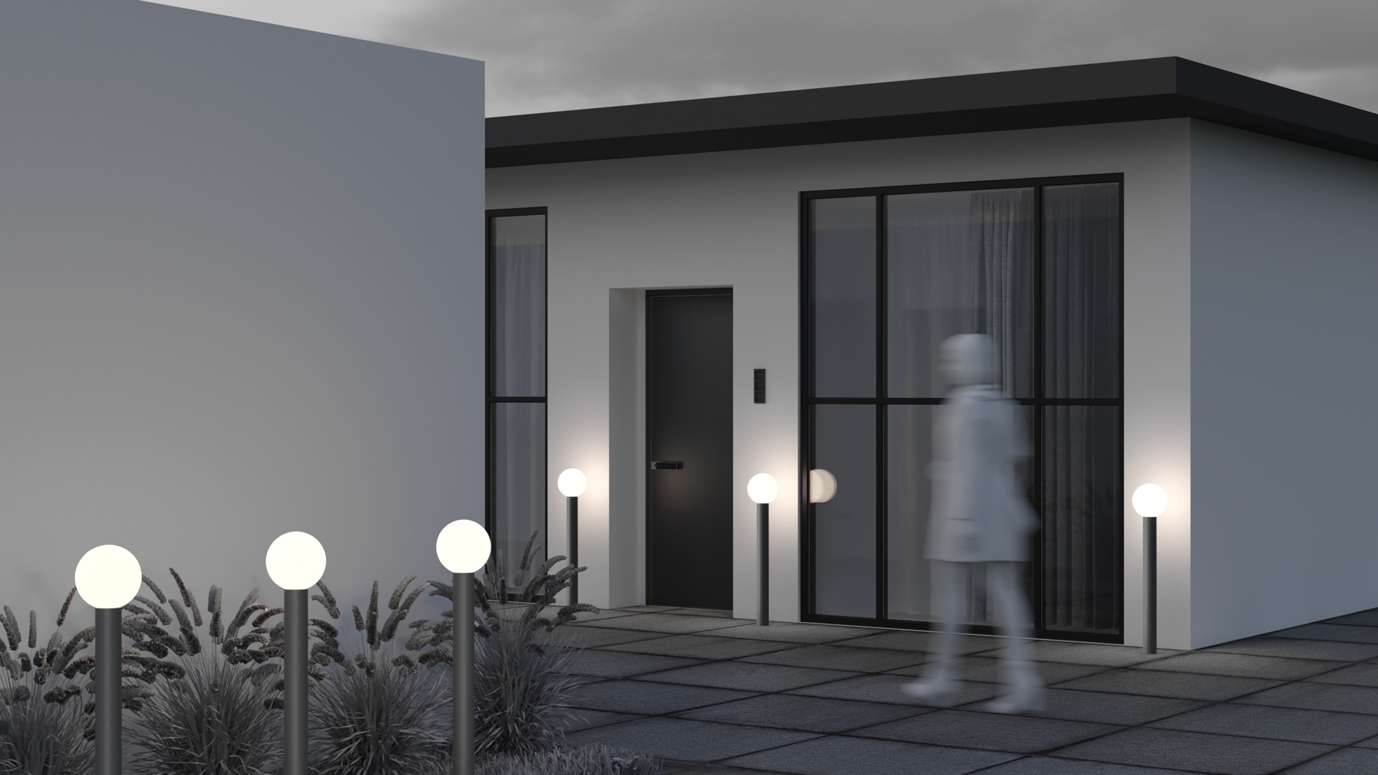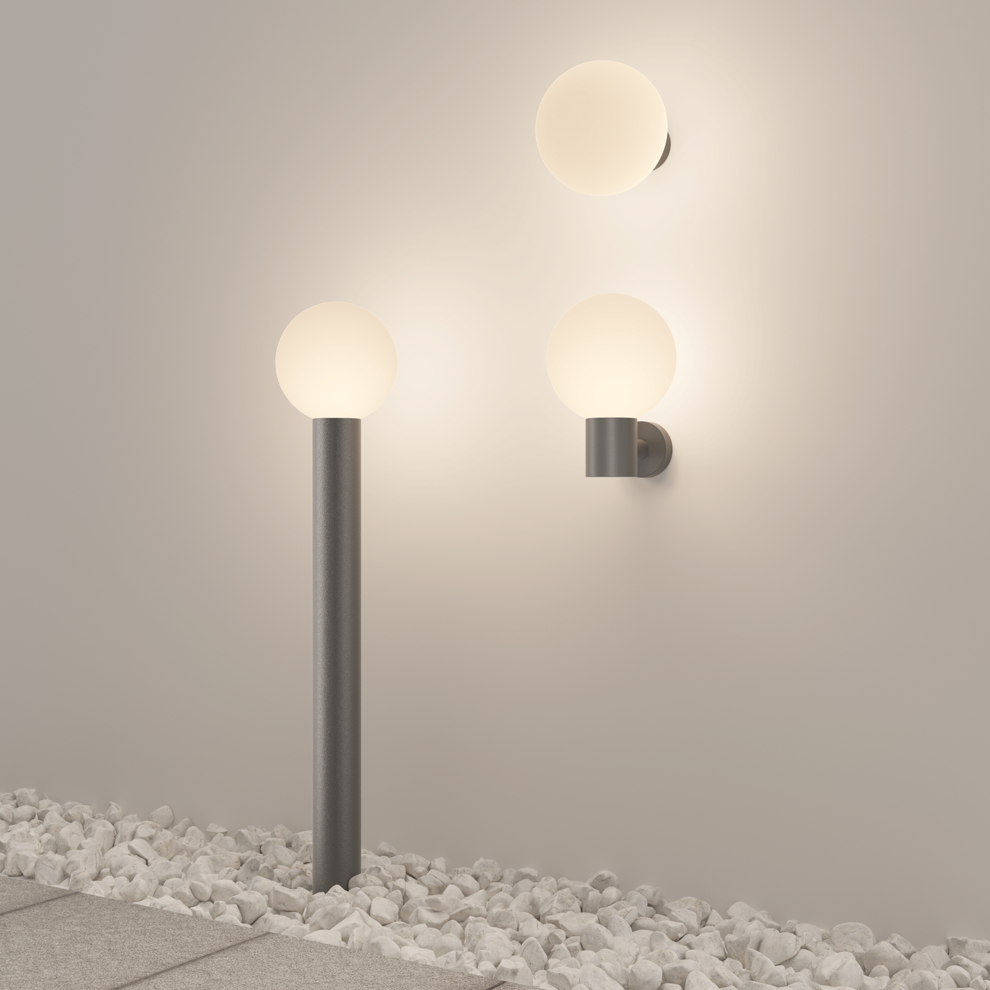 Алюминиевый корпус. Оттенки - черный, серый. Сферические плафоны из белого матового стекла. Защита от коррозии и перападов температур. Высокая степень защиты — IP 54. Источник света — лампа с цоколем E27.