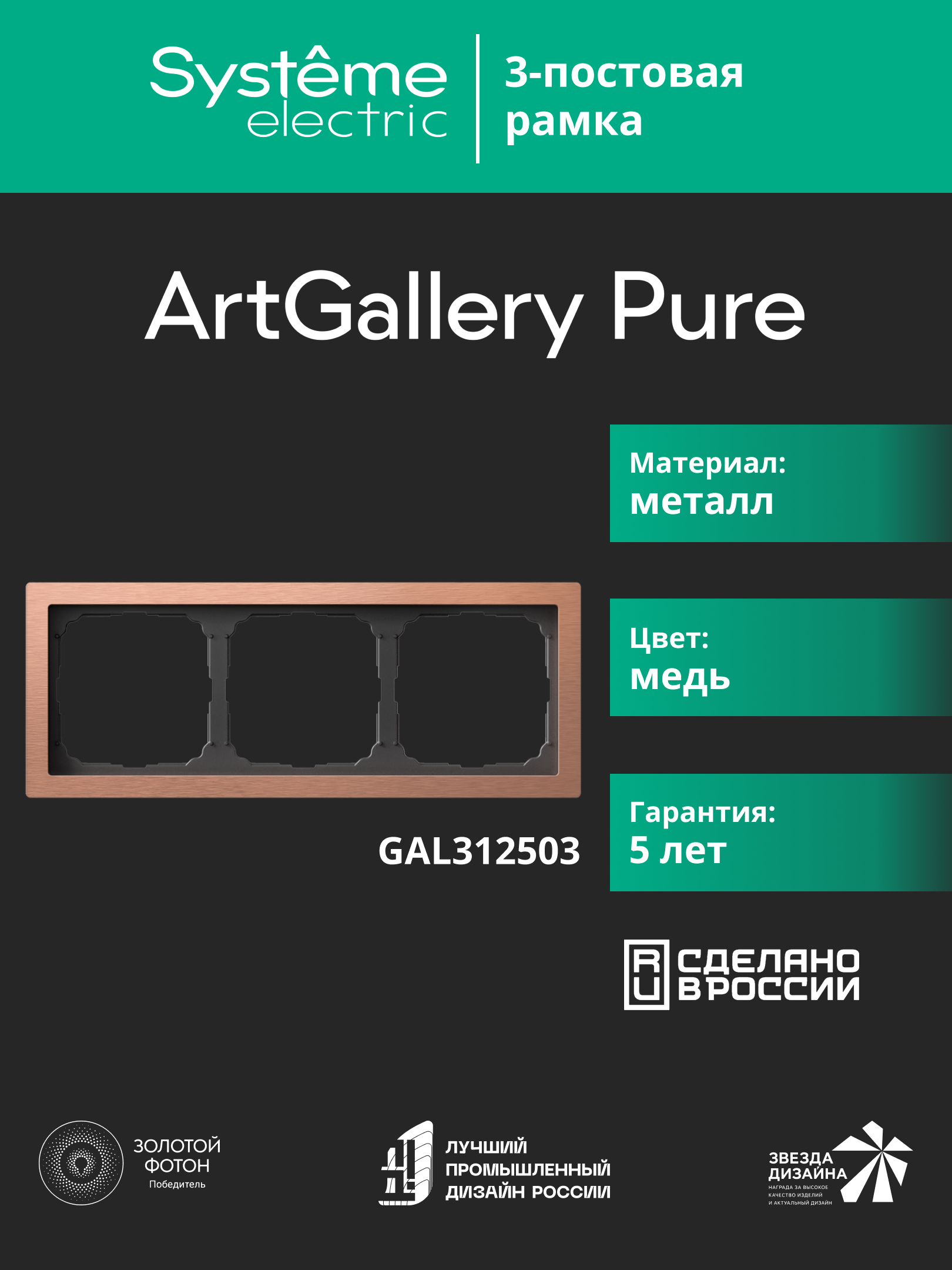 Рамка Systeme Electric серии ArtGallery Pure из металла в цвете медь, в 3-х постовом исполнении. Металл медь - розово-золотой оттенок с живым металлическим переливом, для смелых акцентов. Установка возможна в вертикальном и горизонтальном положениях.