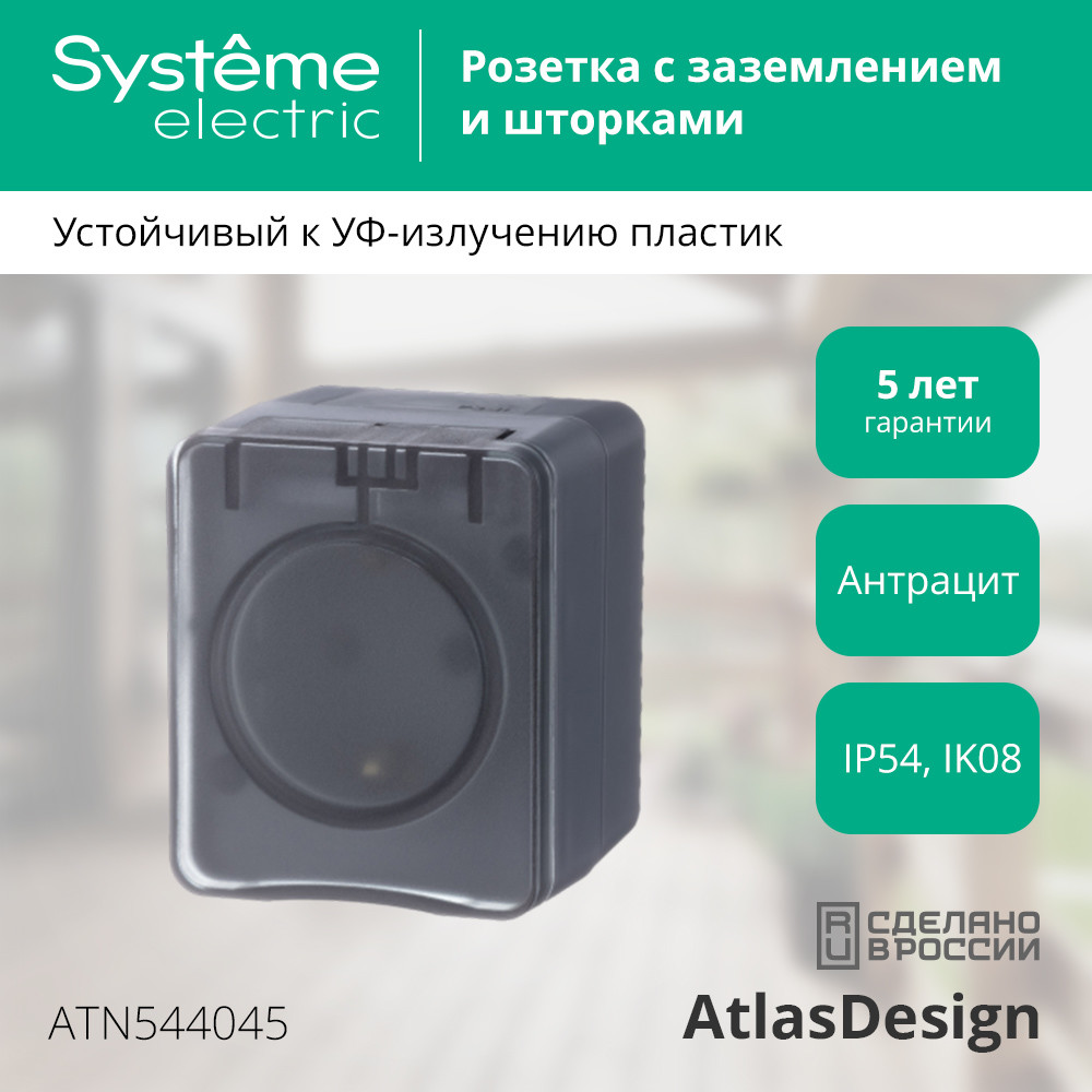 Розетка с заземлением со шторками для открытого монтажа, 16А, 250В.Степень защиты IP:54, Степень защиты IK: IK08. Продукция AtlasDesign Profi54 созданы специально для тех мест, где требуется повышенная защита от влаги и пыли. Уютная веранда в загородном доме, уличное кафе, любимый гараж или мастерская – выключатели и розетки будут обеспечивать надежную защиту и радовать глаз современным дизайном. Элегантный цвет антрацит гармонично впишется в любую обстановку.