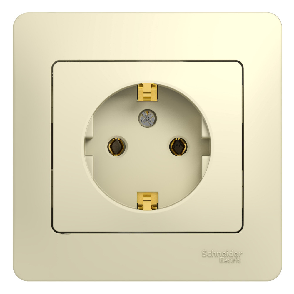 Розетка Systeme Electric (ранее Schneider Electric) серии Glossa (в сборе, цвет бежевый) одинарная с заземлением, без шторок подходит для сетей 250 В, на ток 16 А. Выполнен из материала PС+ASA, стойкого к УФ-излучению и появлению царапин. Эргономичные клеммы розеток расположены в один ряд.