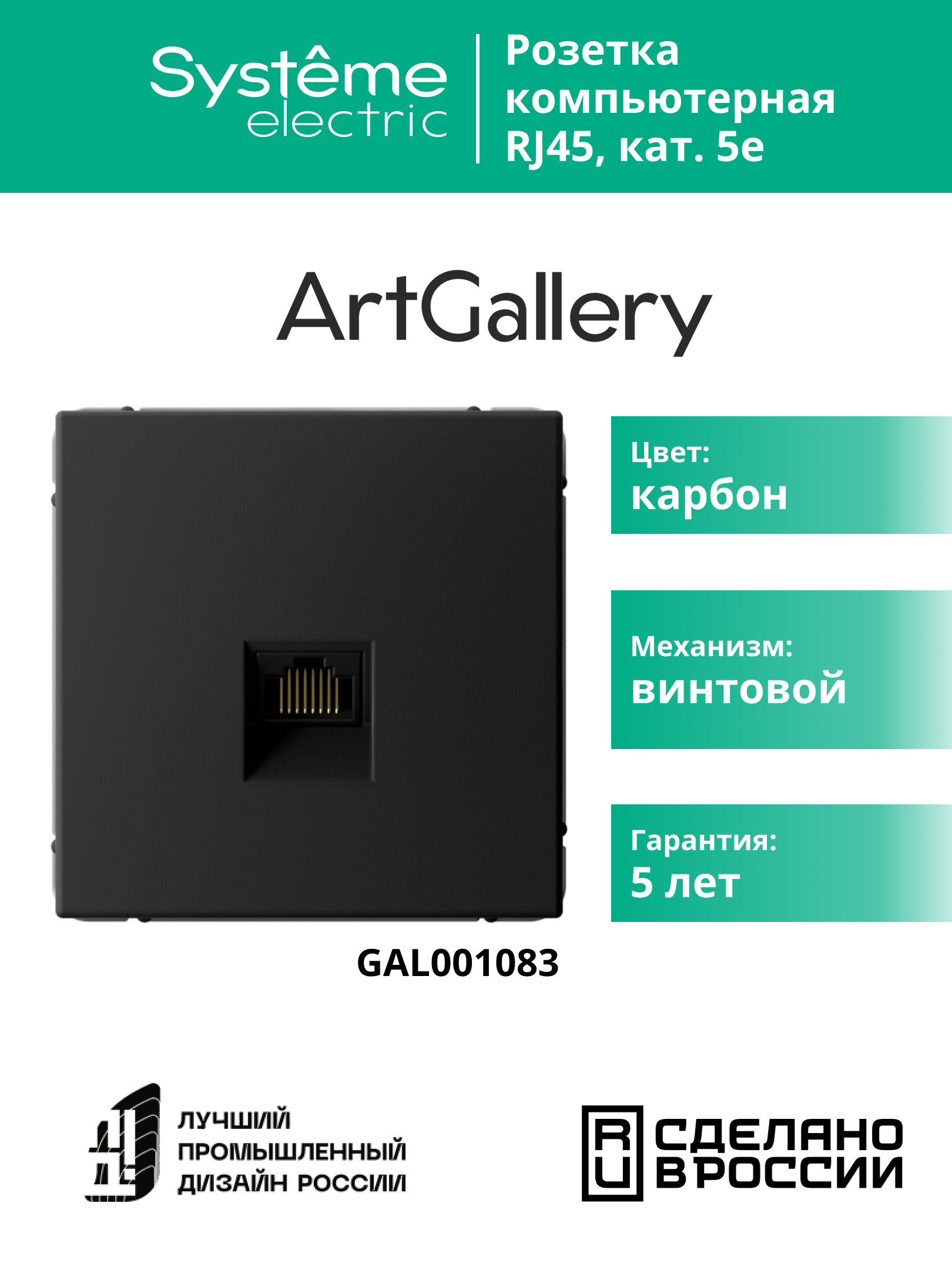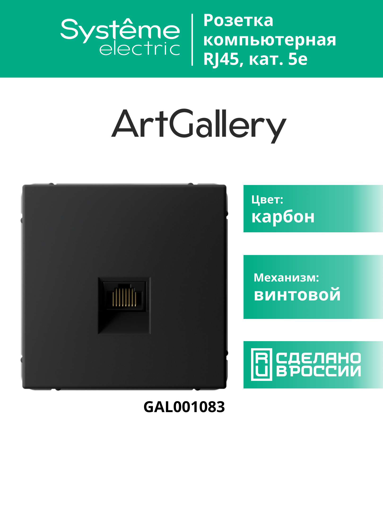 Механизм Systeme Electric серии ArtGallery в цвете карбон розетки компьютерной с разъёмом RJ45 категории 5Е предназначен для удобного и быстрого подключения вашего компьютера к локальной вычислительной сети.К изделиям в этом роскошном цвете приятно прикоснуться.Обладает высокой скоростью передачи данных до 10 Гбит/с, диапазон частоты до 500 МГц.Лицевые детали из качественного ABS-пластика, устойчивого к царапинам и УФ-излучению.Лучший промышленный дизайн (по итогам премии Минпромторг 2023).