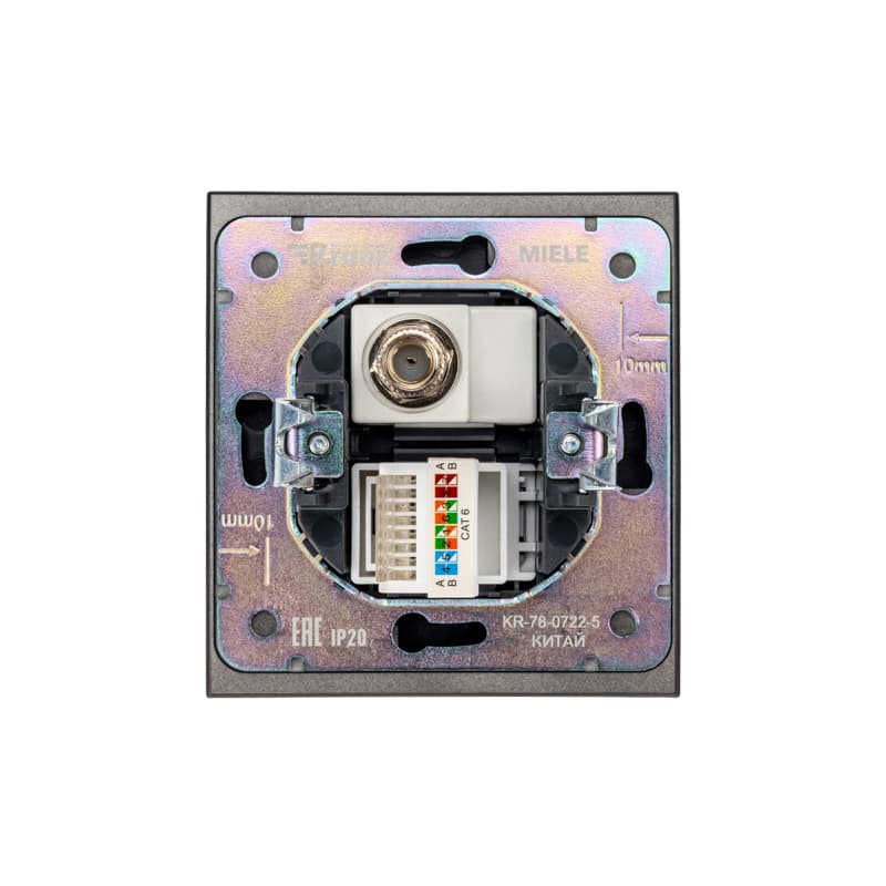 Механизм компьютерной и телевизионной розетки скрытой установки KRANZ предназначен для проводного подключения устройств к сети интернет посредством кабеля RJ45 CAT6, а также для подключения телевизионных приемников к коаксиальной кабельной сети. Используется в квартирах, офисах, в загородных домах.Модель механизма розетки обеспечивает высокоскоростное и бесперебойное соединение.Благодаря лаконичной форме корпуса и нейтральному благородному антрацитовому цвету устройство гармонично дополнит любой интерьер.Технические характеристики: частота: 5.0...862.0 Гц.