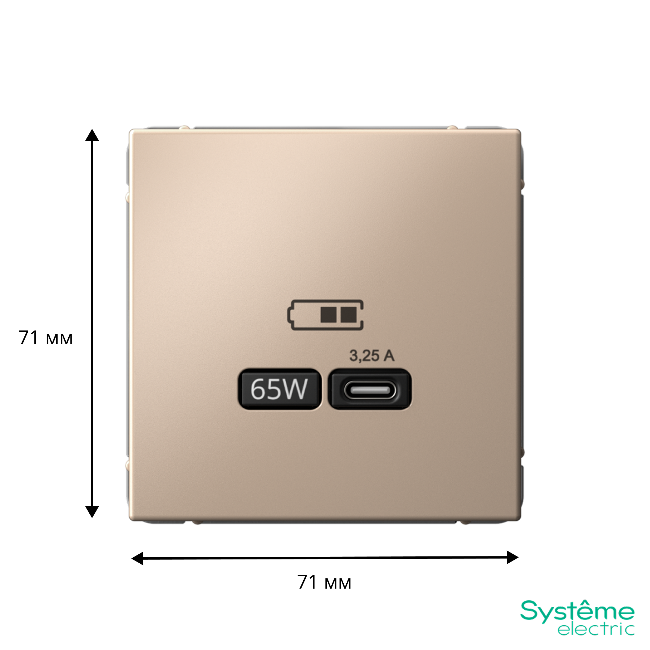 Розетка Systeme Electric серии ArtGallery в цвете песочный USB с разъемом типа C высокоскоростная.Трендовый оттенок позволит удачно подчеркнуть стиль интерьера и правильно расставить акценты.Самая современная USB-зарядка позволяет заряжать ноутбук, а также смартфоны последнего поколения, которые поддерживают функцию быстрой зарядки.Мощность: тип-С 65Вт.Поддерживает современные протоколы быстрой зарядки QC, PD, последних версий.Лицевые детали из качественного ABS-пластика, устойчивого к царапинам и УФ-излучению.Лучший промышленный дизайн (по итогам премии Минпромторг 2023).