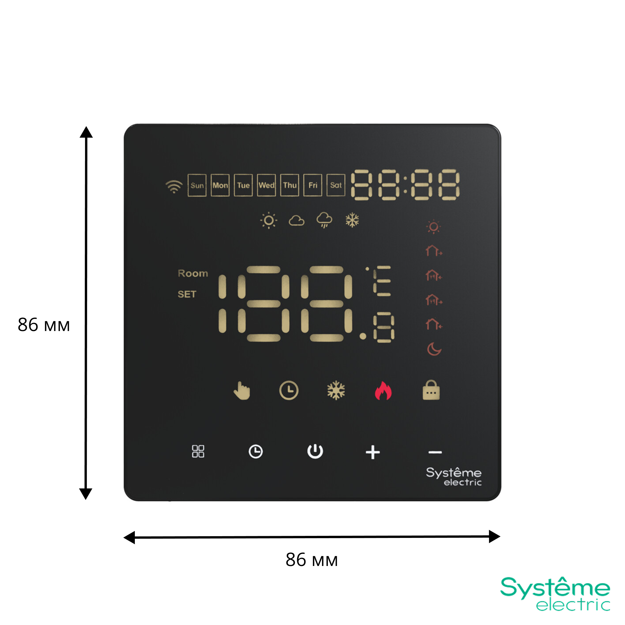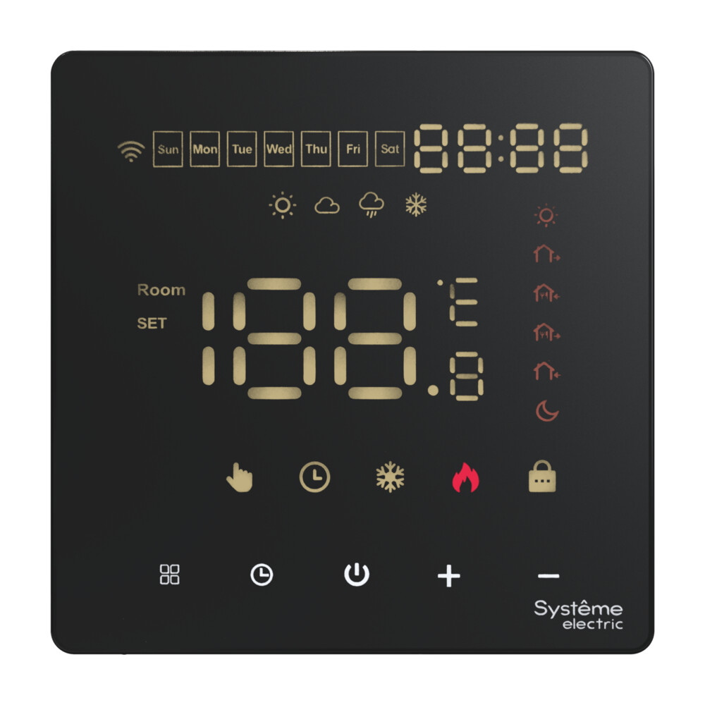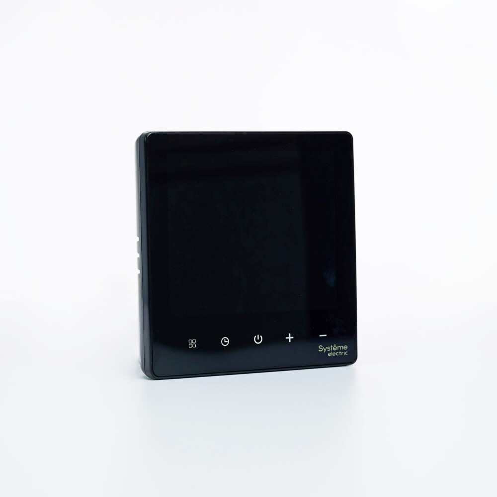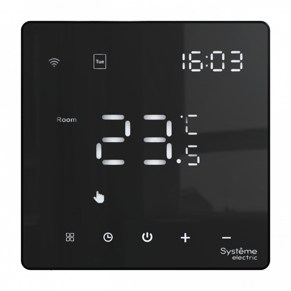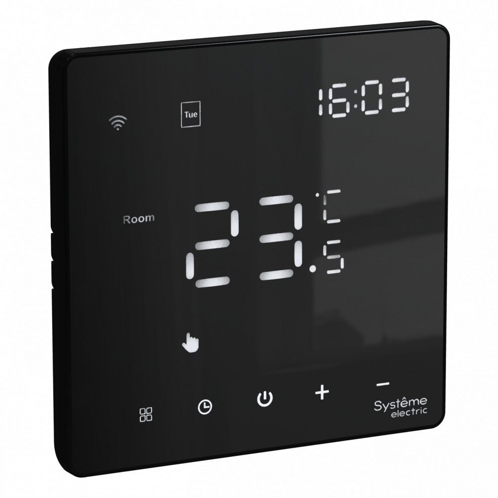 Термостат для электрического теплого пола Systeme Electric серии ArtGallery в цвете черный с Wi-Fi, 16 АУправлять теплым полом стало еще удобнее:• большой дисплей позволяет удобно сделать все настройки на самом устройстве;• можно установить расписание на неделю и включать теплый пол только утром и вечером;• два датчика: встроенный и выносной позволяют более точно регулировать теплый пол;• можно удаленно управлять теплым полом и включить его заранее по дороге домой.