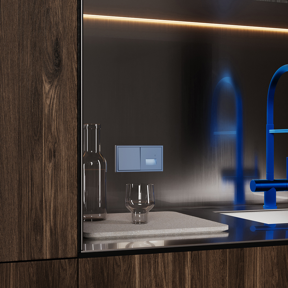 Модульная система серии S70 с раздельной поставкой механизмов, накладок и рамок позволяет монтировать электротехническую основу во время черновых работ, а выбор стилевого решения отложить до завершения дизайн-проекта. При смене интерьера вы легко обновите внешний вид, заменив только лицевые панели без вмешательства в проводку. Лёгкость и яркость оттенка "Деним" прекрасно комбинируется с голубо-бирюзовой палитрой. Он станет удачным выбором для детских пространств и интерьеров кафе, добавляя им живости и современности.