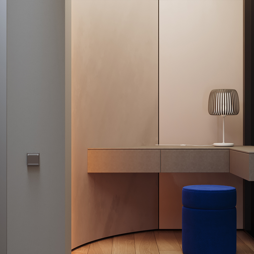 Модульная система серии S70 с раздельной поставкой механизмов, накладок и рамок позволяет монтировать электротехническую основу во время черновых работ, а выбор стилевого решения отложить до завершения дизайн-проекта. При смене интерьера вы легко обновите внешний вид, заменив только лицевые панели без вмешательства в проводку. Оттенок «Капучино» создает в интерьере теплую и стильную атмосферу. Этот актуальный коричневый тон придает пространству глубину, уют и современную эстетику.