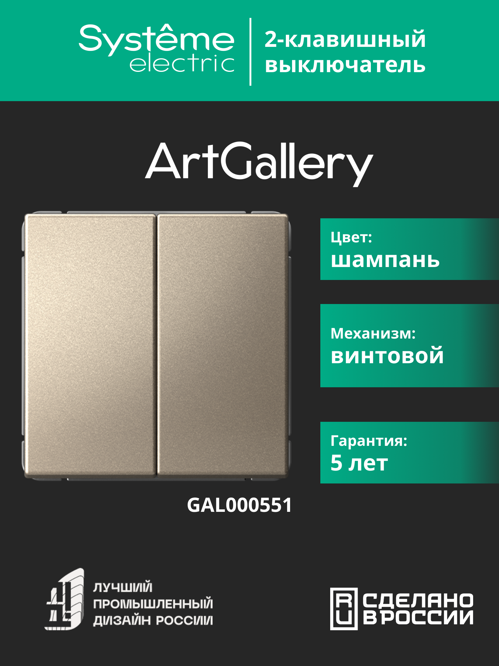 Механизм выключателя 2-клавишного Systeme Electric серии ArtGallery в цвете шампань подходит для сетей 250 В, на ток 10 А.Классическое цветовое решение станет изюминкой любого интерьера.Двухклавишный выключатель позволяет управлять двумя источниками света с одной точки.Лицевые детали из качественного ABS-пластика, устойчивого к царапинам и УФ-излучению.Лучший промышленный дизайн (по итогам премии Минпромторг 2023).
