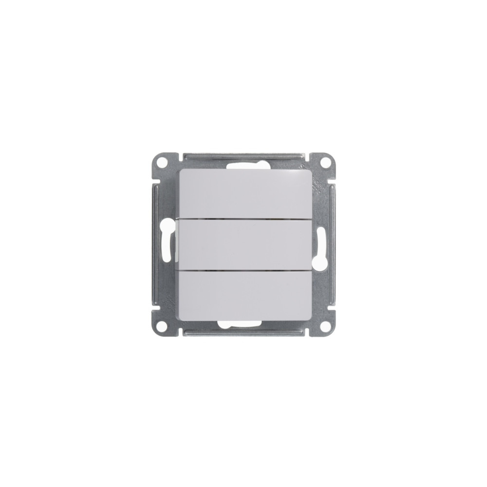 Механизм Systeme Electric (ранее Schneider Electric) серии Glossa (цвет белый) выключателя 3-клавишного подходит для сетей 250 В, на ток 10 А. Трёхклавишный выключатель позволяет управлять тремя источниками света из одной точки. Выполнен из материала PС+ASA, стойкого к УФ-излучению и появлению царапин. Эргономичные клеммы расположены в два ряда: сверху и снизу.
